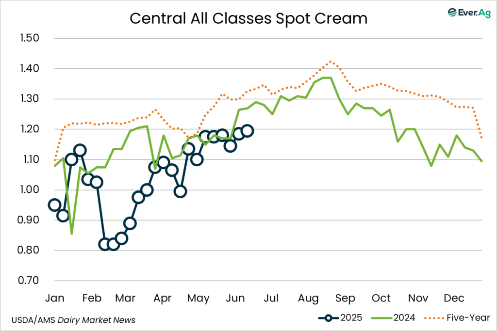 Cream is available in the Central region and contacts say ice cream makers are scooping up greater volumes to meet their summer production needs. Butter makers continue to use available cream volume to run busy production schedules.