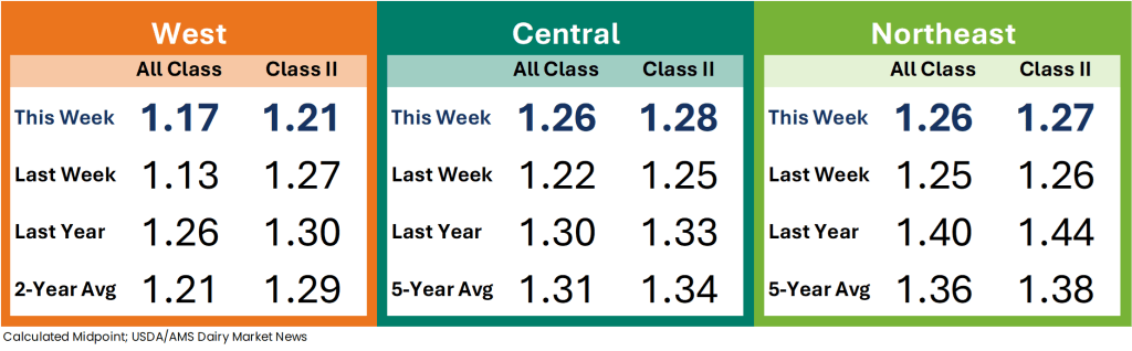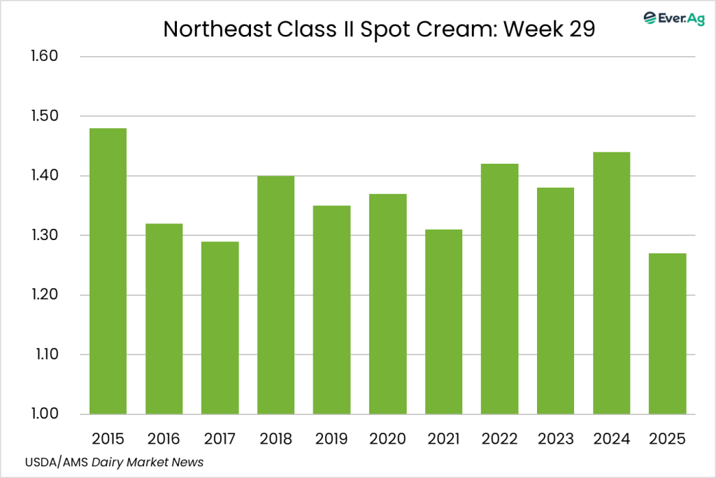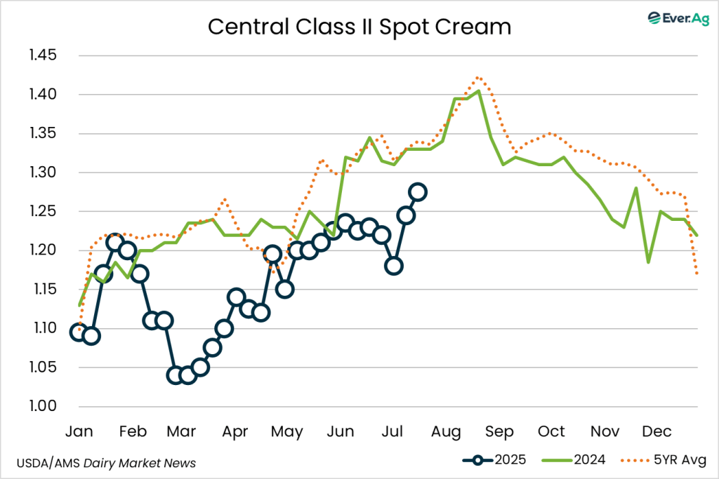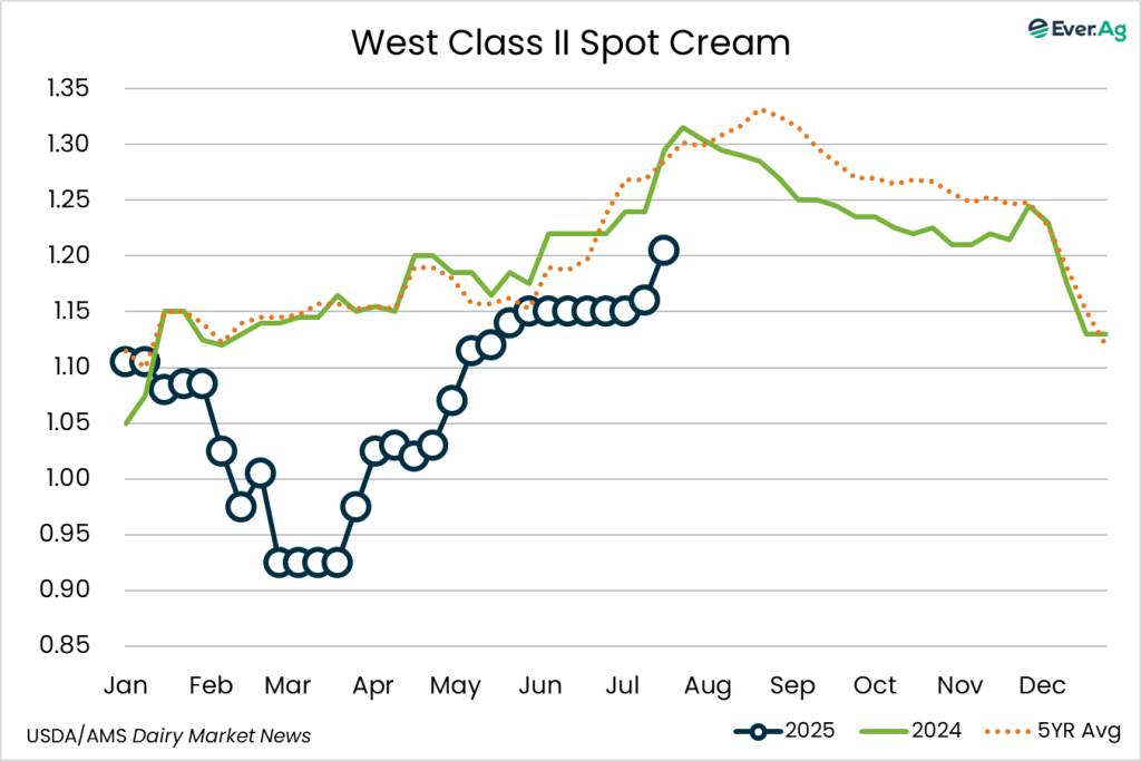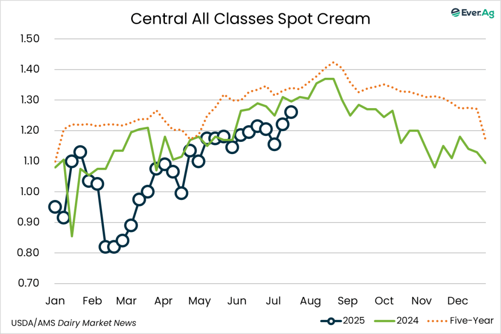 Cream production is declining as milk components are seasonally declining. Contacts report cream is available, but spot inventories are tightening as ice cream makers are purchasing large volumes of cream. Butter makers are purchasing cream to keep churning active.