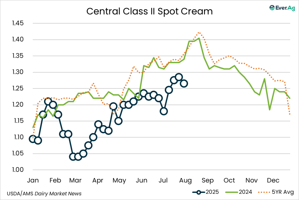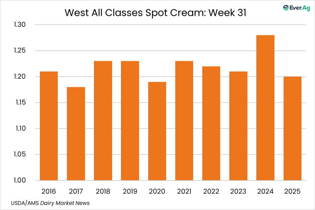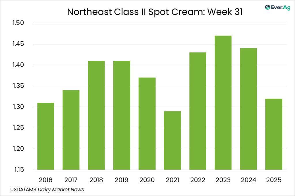 Cream production is declining in the region. This decline is counterbalanced by declining demand from ice cream makers, keeping spot volumes of cream available in the region. Butter makers are securing available cream to run busy production schedules.