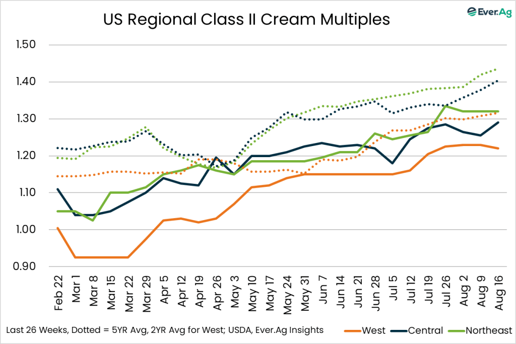 Churn activity is generally slower, even though some facilities report prioritizing butter production over using cream for other product types. The cream multiples range did not change this week, with contacts stating they are able to buy or sell within the same range.
