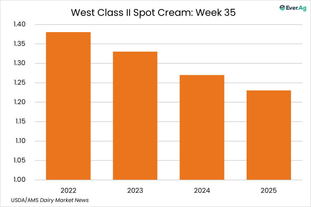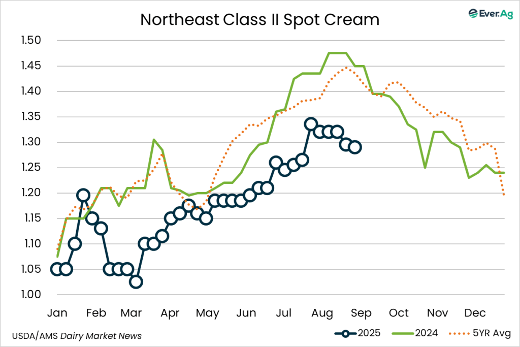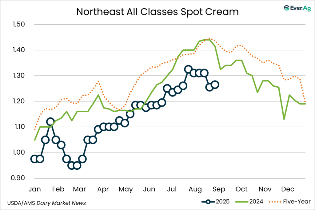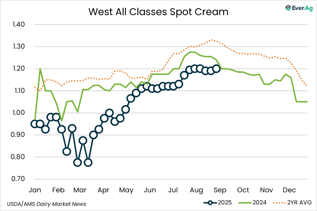 Cream supplies remain available in the region for spot purchases. Butter production is generally higher, but some manufacturers are choosing to sell cream to other producers rather than send it to the churns. Cream multiples increased slightly at the bottom of the range and remained the same at the top.
