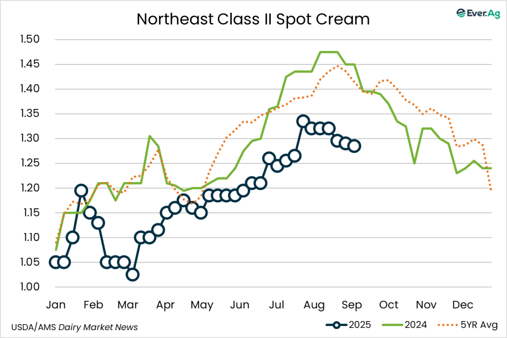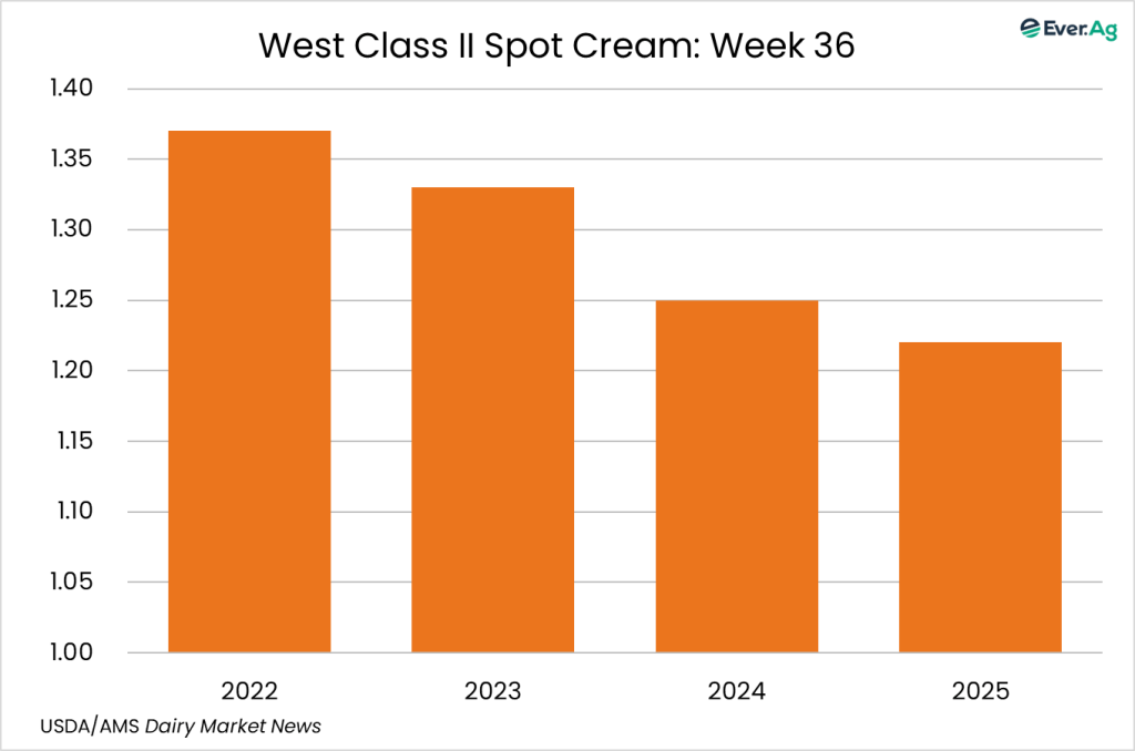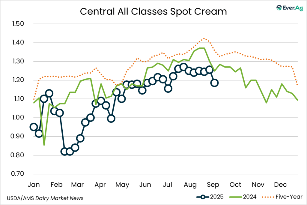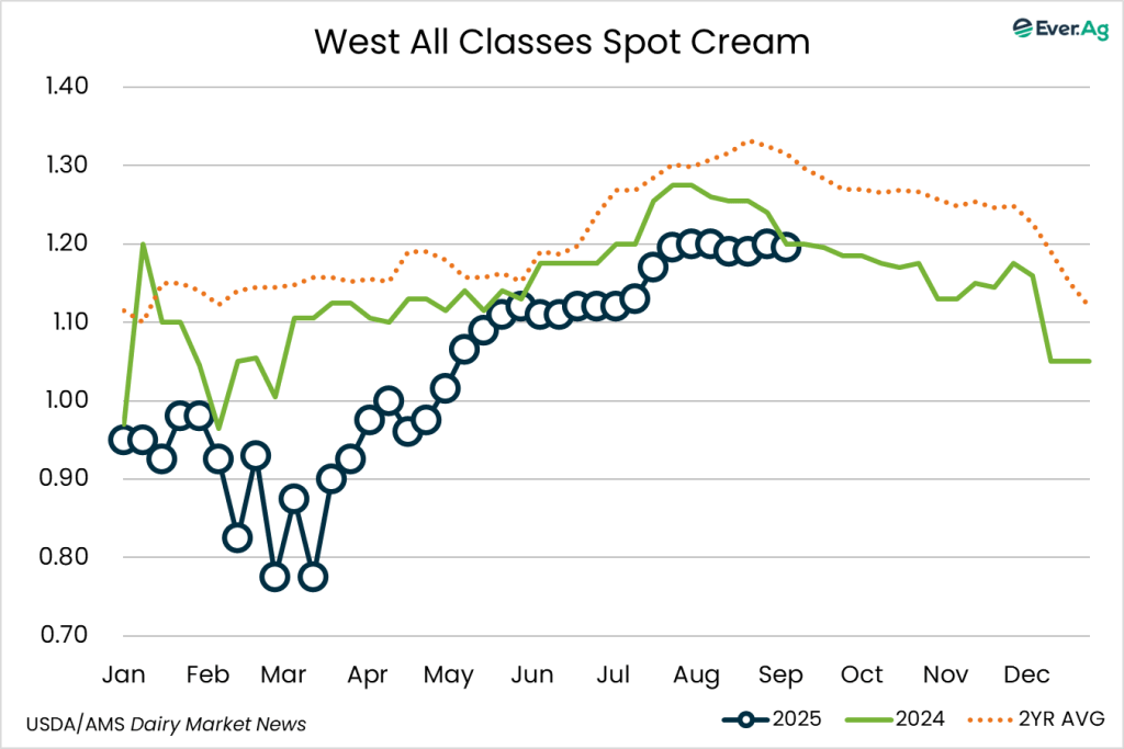 Cream remains plentiful in the region. Downtime over the Labor Day weekend caused some manufacturers to offer cream volumes at lower multiples this week.