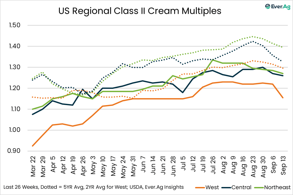 Plenty of cream is available throughout the region. Cream demand is mixed. Cream multiples moved lower this week, especially regarding purchases for Class IV manufacturing.