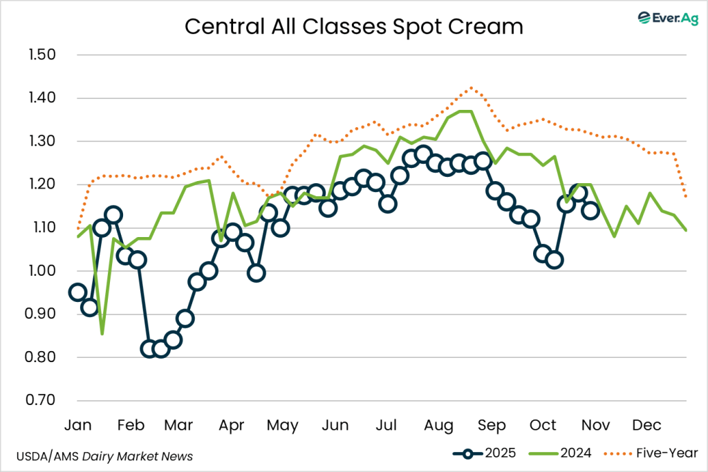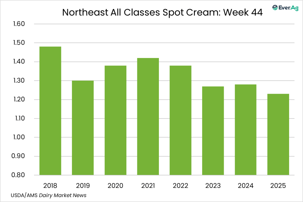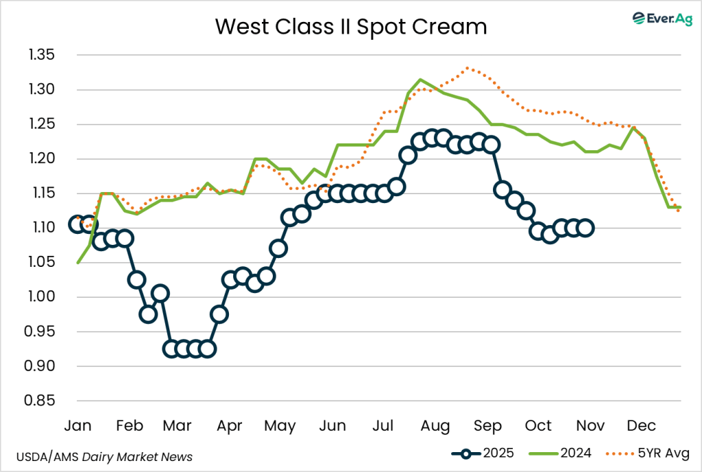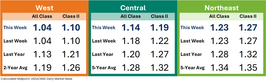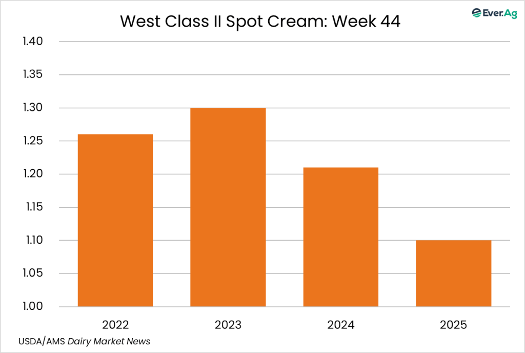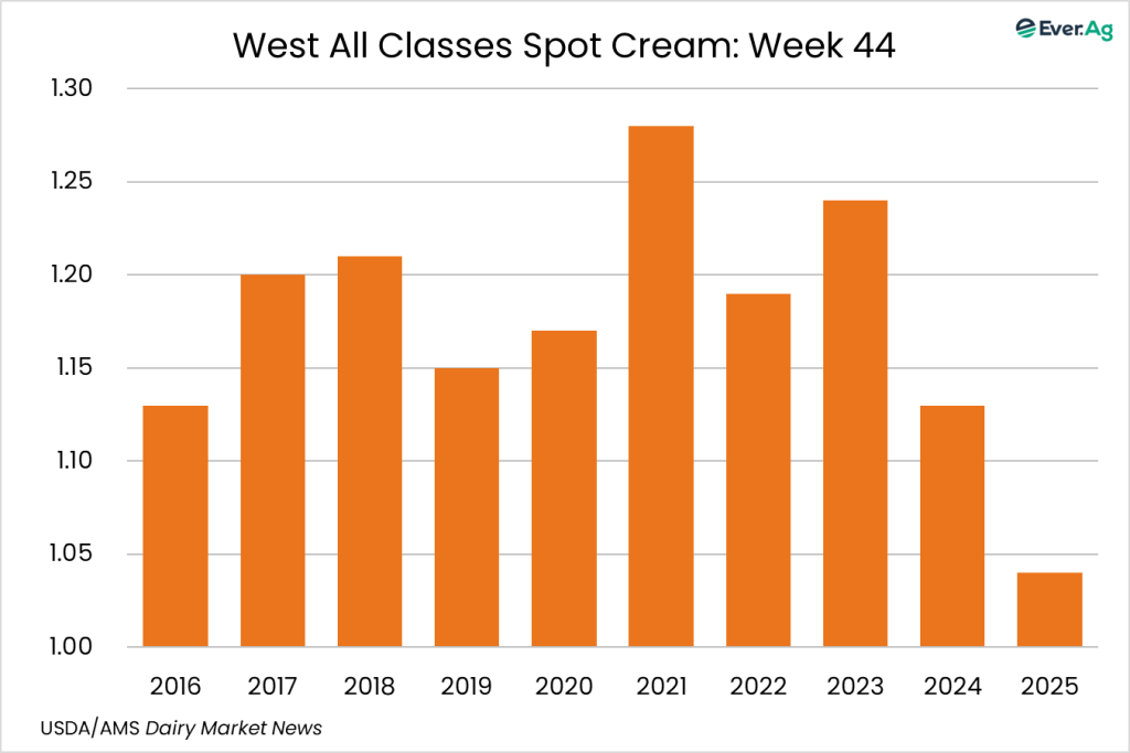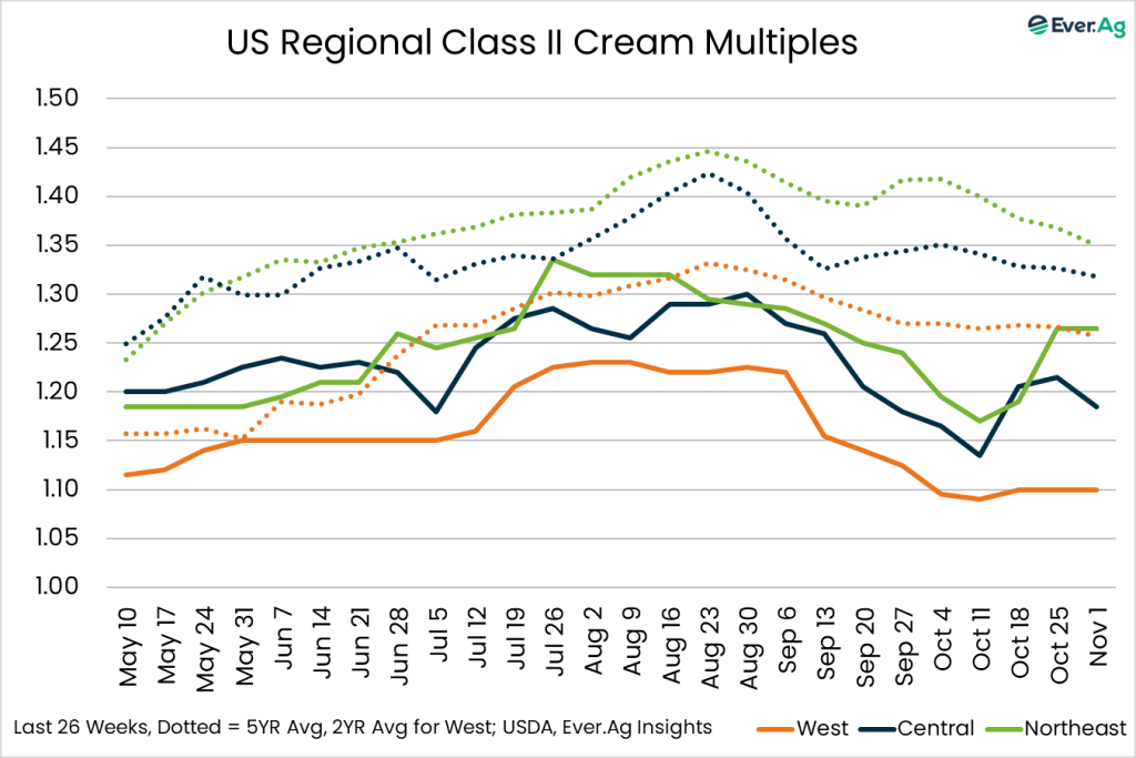 Cream is plentiful throughout the West. Cream demand varies from steady to stronger. Cream multiples are unchanged from week 43.