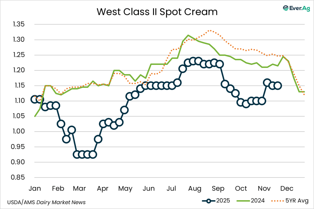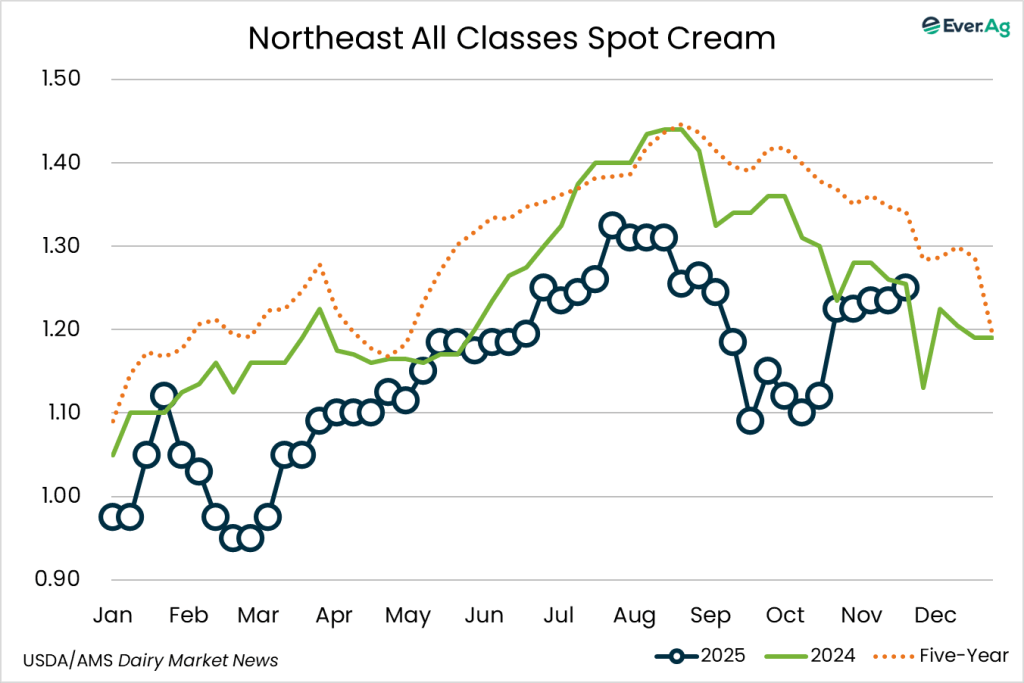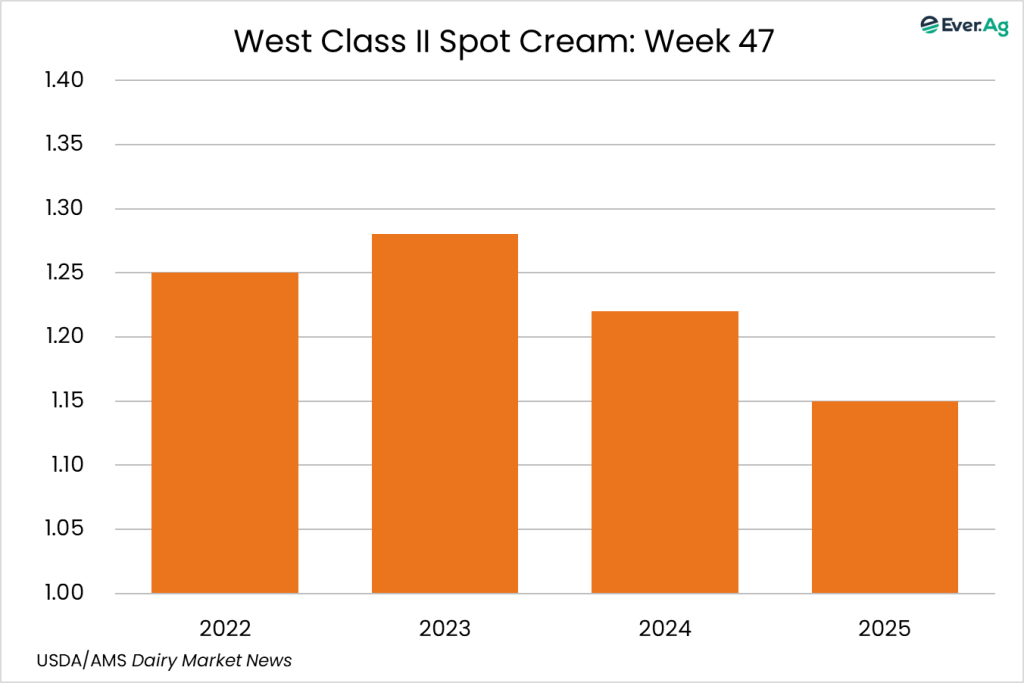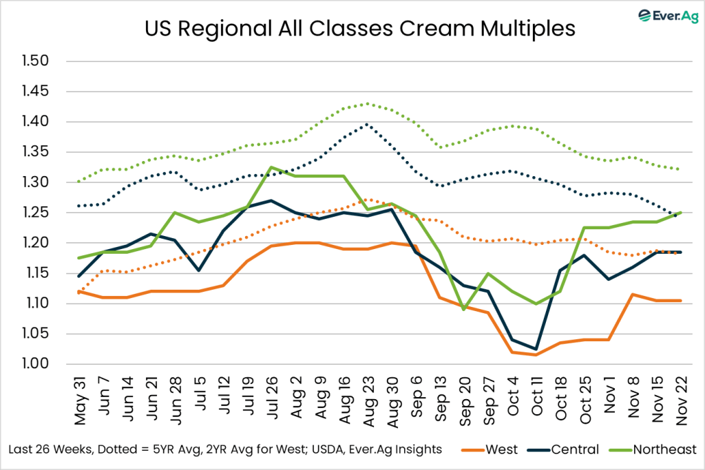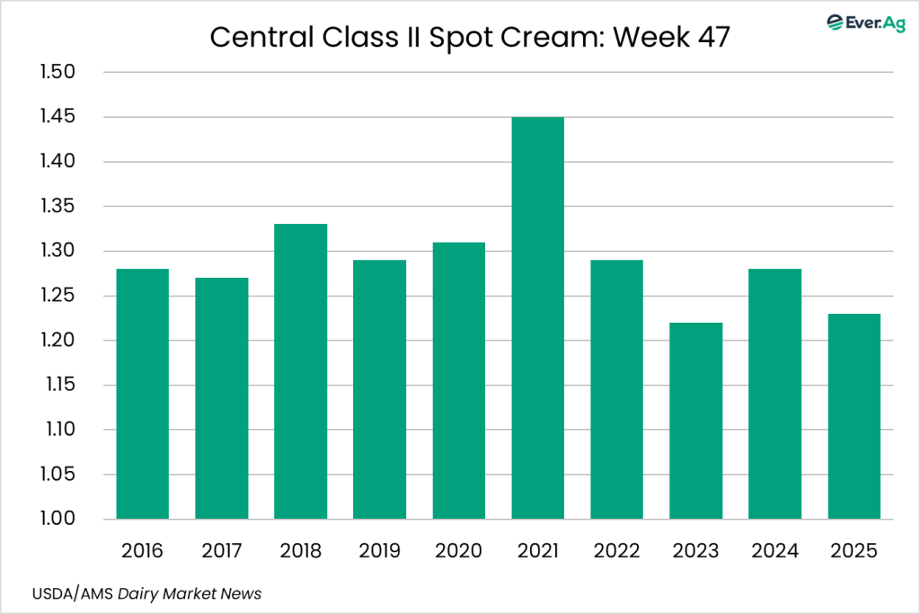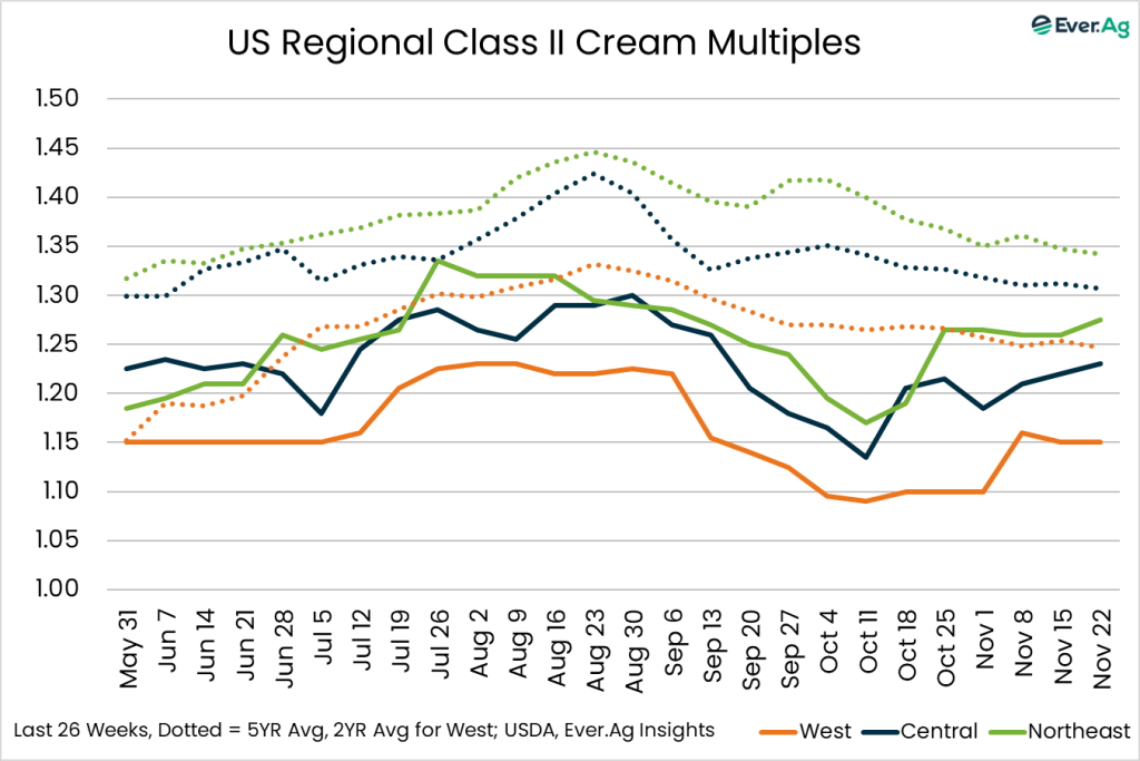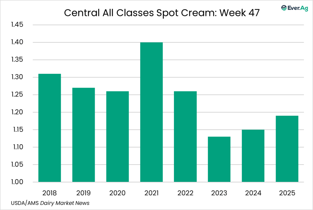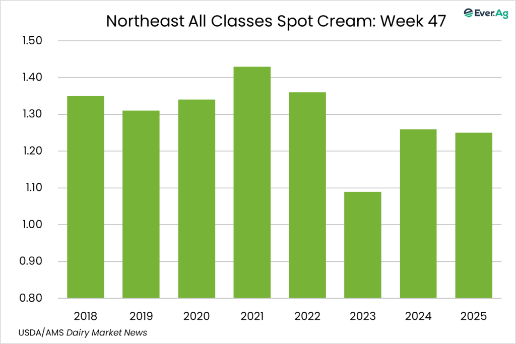 Cream demand is stronger. Spot cream availability varies from steady to tighter. Cream multiples are unchanged for week 47. A few stakeholders note cream buyers purchasing additional loads for immediate or near term delivery to contractual purchase agreements, due to lack of spot loads. No changes in condensed skim milk demand or availability are reported.