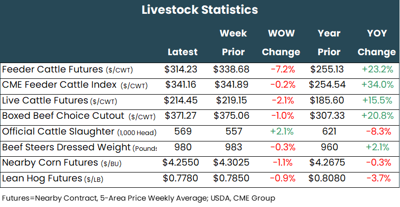 Live cattle futures finished the week down $0.58 to $4.75 per hundredweight, with the greatest losses in the nearby contracts. December settled at $214.45 per hundredweight, down $4.70. Feeder cattle futures finished the week down $3.97 to $6.32 per hundredweight, with the greatest losses also in the nearby contracts. January, now the nearby contract, closed at $314.23 per hundredweight, down $6.32.