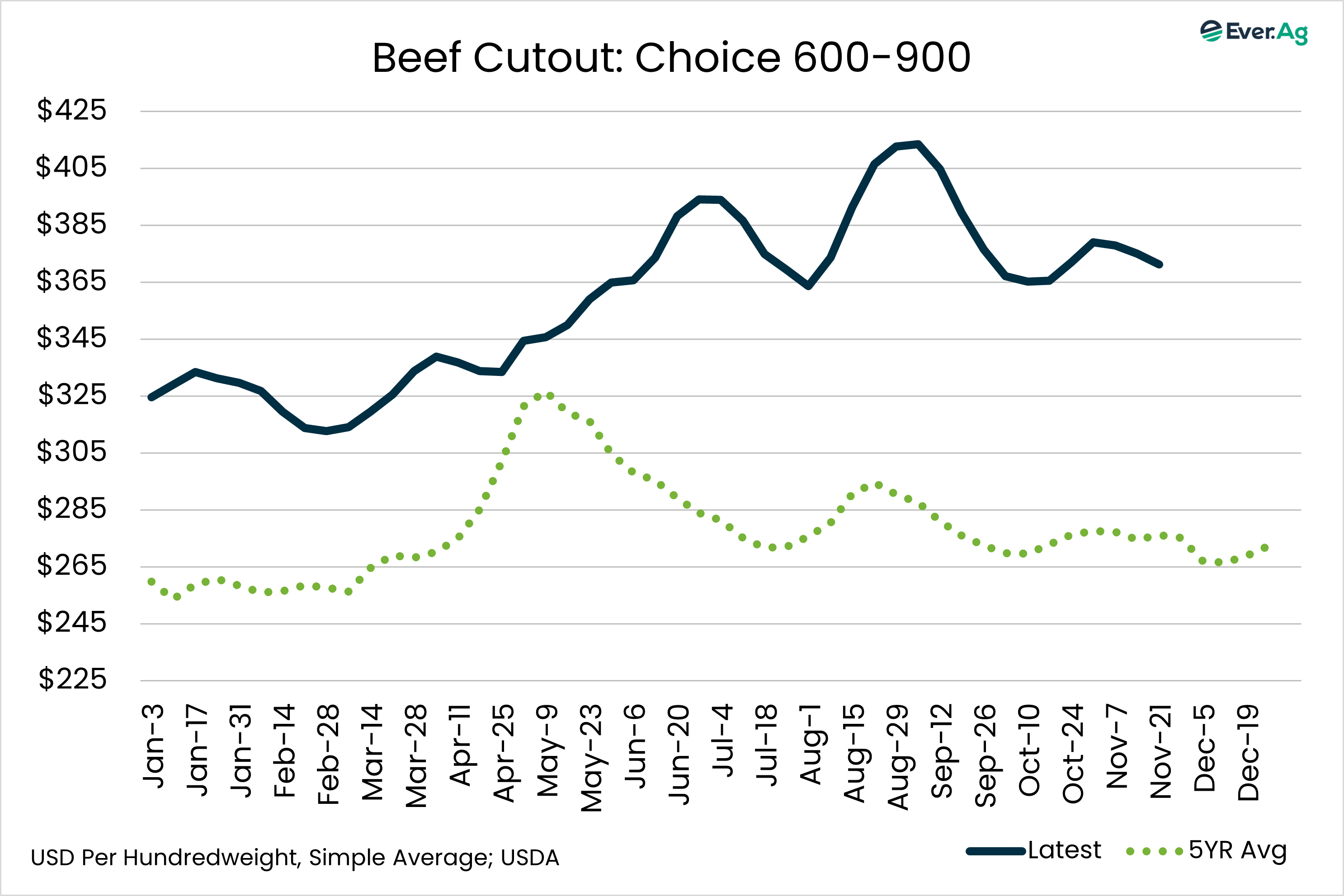 USDA reported the beef choice cutout for the week at an average of $371.27 per hundredweight, down 1.0%.