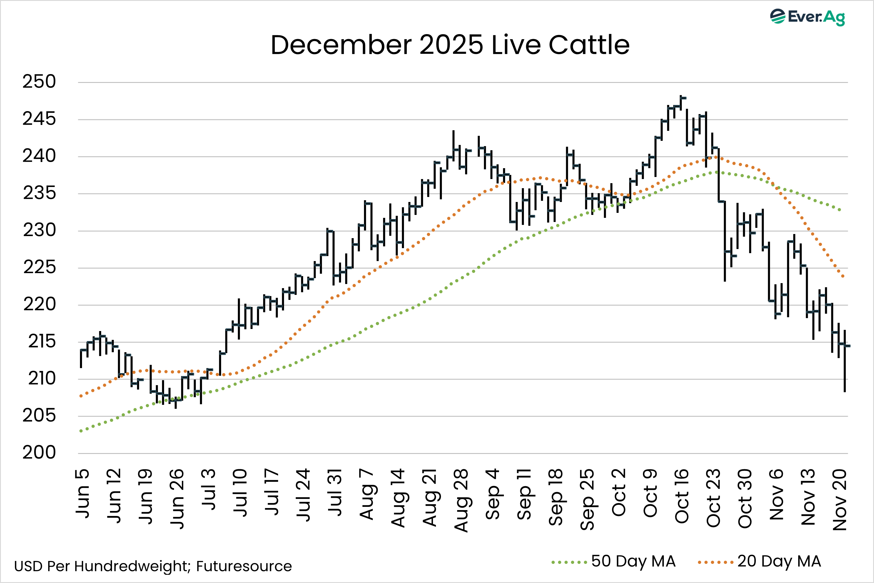 As for the charts, they remain in tough shape. The most actively traded February live cattle contract closed below the 200-day moving average for the first time on Thursday and again on Friday. Today, we saw skirmishes around the psychological support areas of $200 per hundredweight in live cattle and $300 in feeder cattle, with some deferred contracts breaching those levels for a short time.