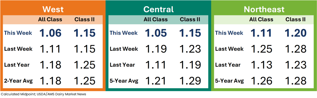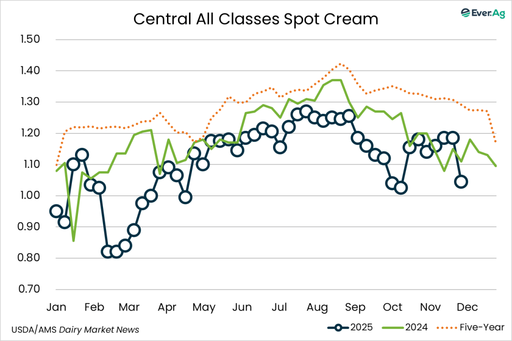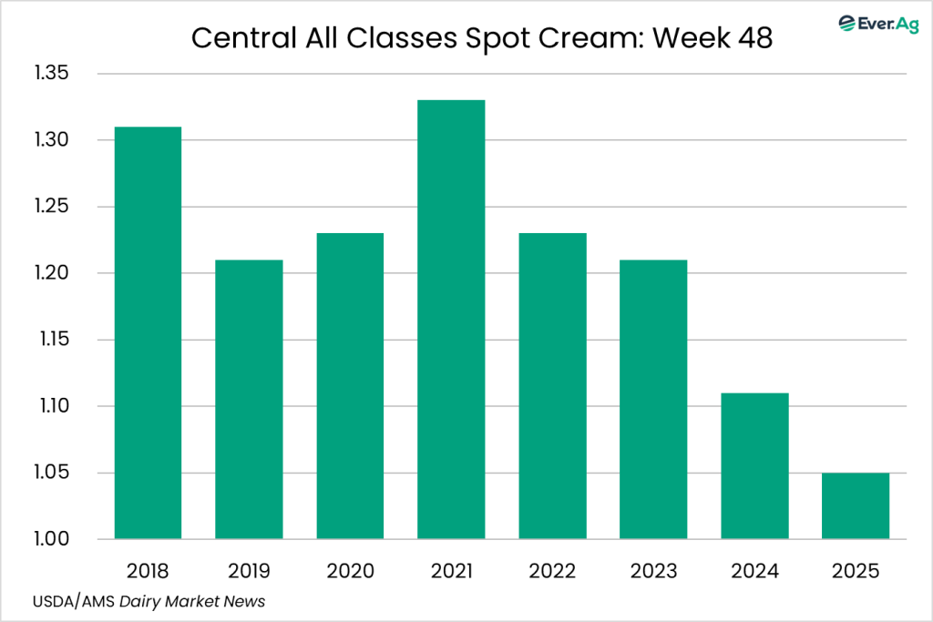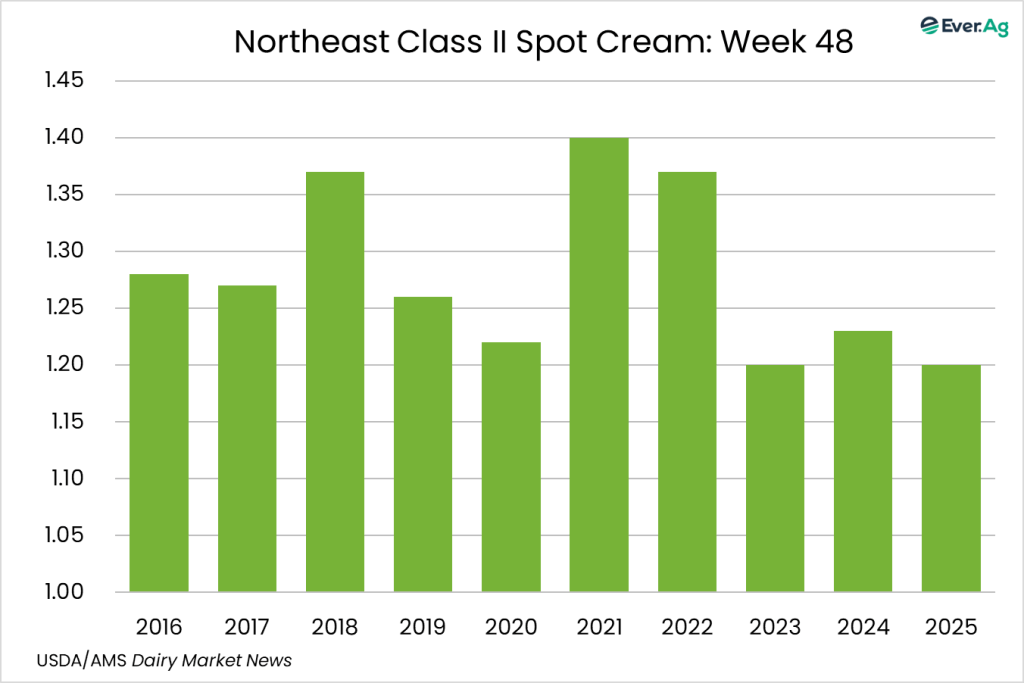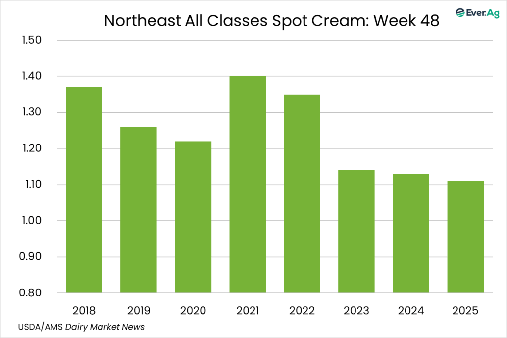 Cream demand is mixed for the holiday week. Cream multiples are below the bottom end and above the top end of the week 47 All-Classes range. Condensed skim milk demand and availability are steady.