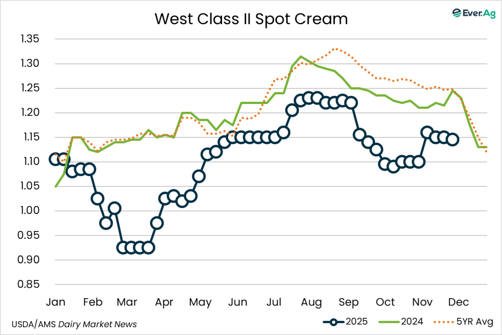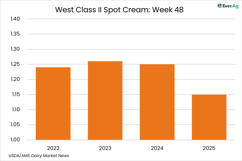 Cream remains plentiful in the region and butter makers report lower multiples than last week, showing significant declines due to the Thanksgiving holiday. Butter production is lighter this week as several processors are not purchasing additional spot cream as they prepare for downtime.