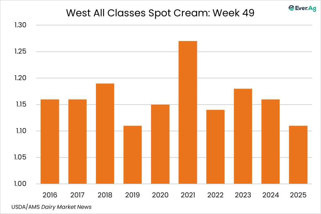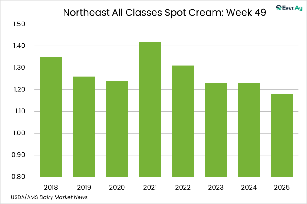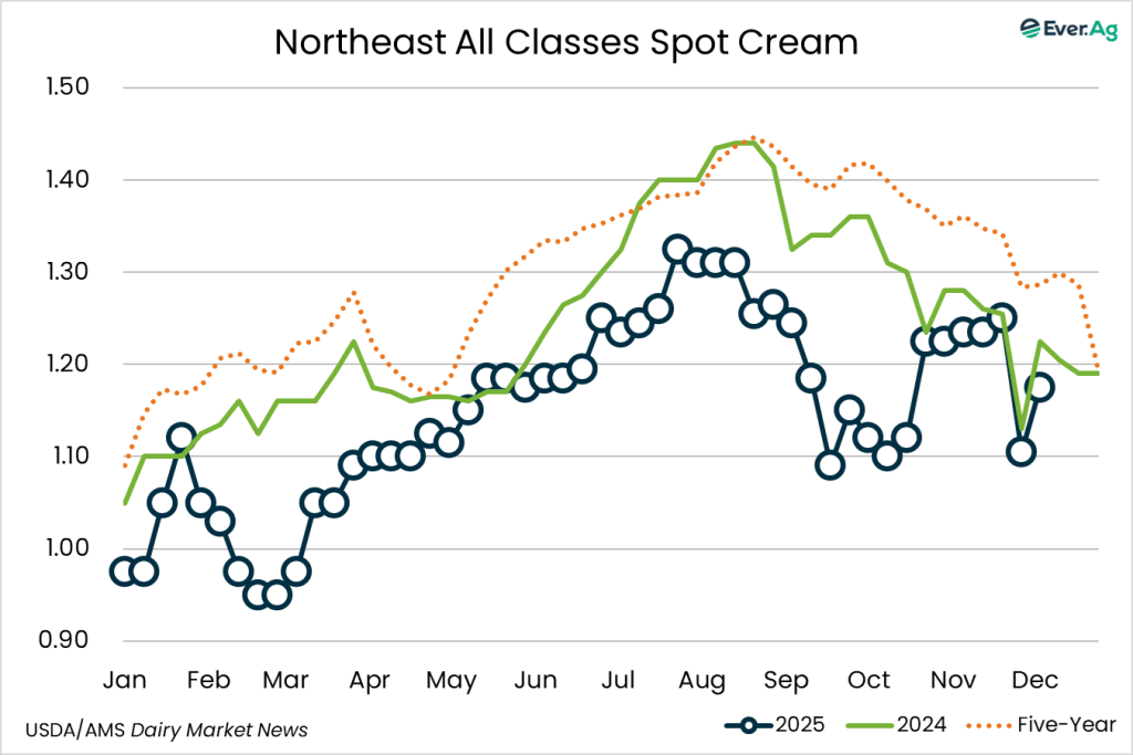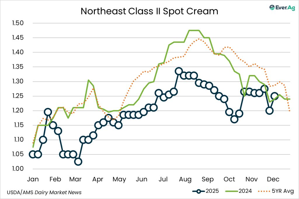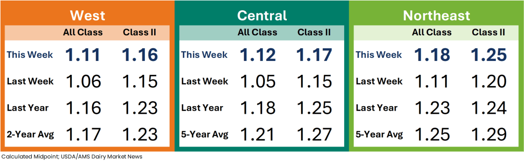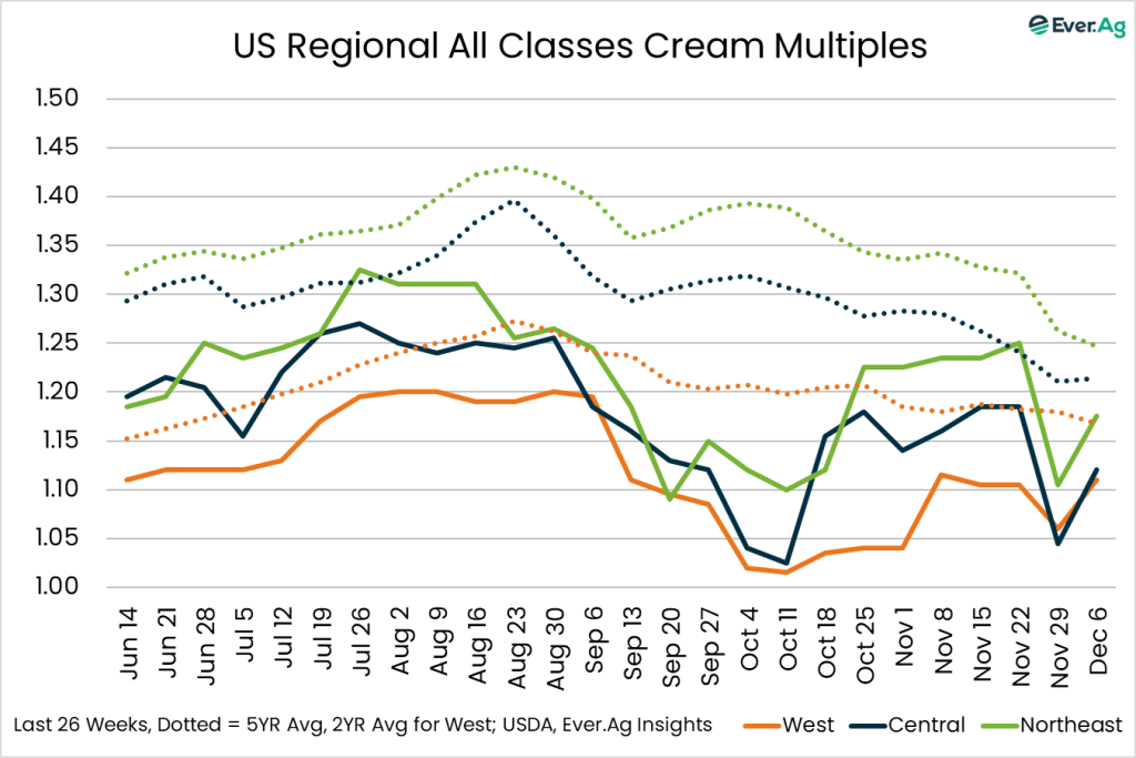 Cream is widely available in the region. Butter makers are taking in spot loads of cream to account for increased retail demand of butter. Spot loads for Class II and III manufacturers are also rosing this week. Cream multiples are increasing back to flat Class price at the bottom of the range.