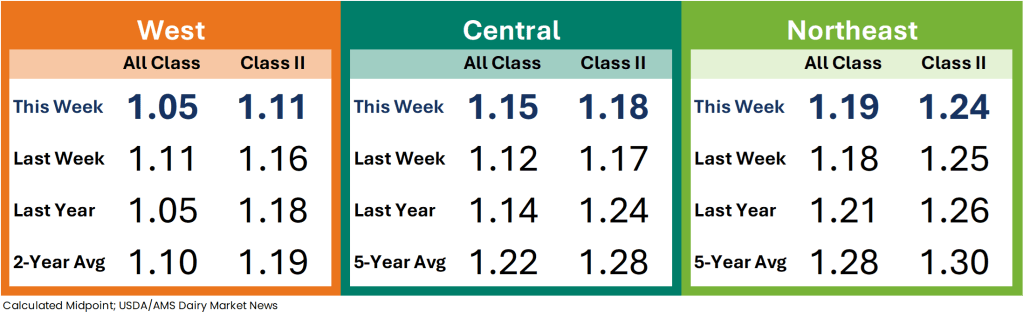Most butter makers are using contract loads for their production needs, but there are reported spot sales of cream for churn use. Cream multiples increased at the bottom of the range and decreased slightly at the top. Condensed skim demand was steady to strong this week. At the beginning of the week, manufacturers were struggling to keep up with demand, but the demand tapered as the week continued. Prices for condensed skim ranged from flat to $0.15 over Class.