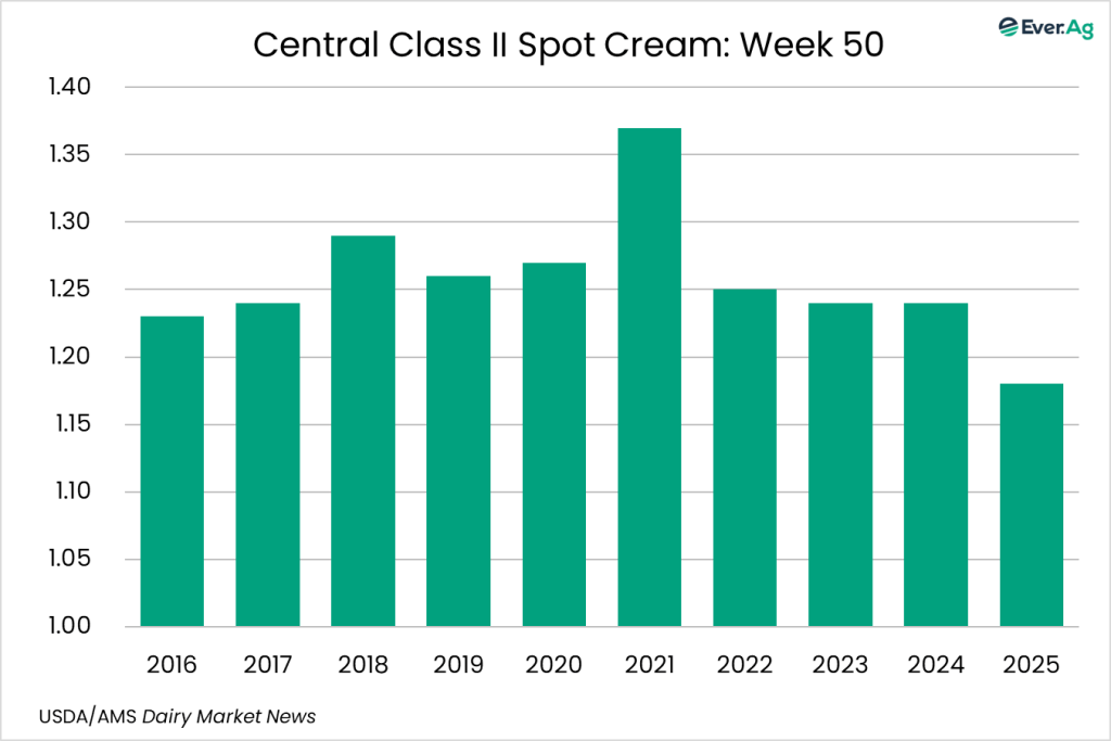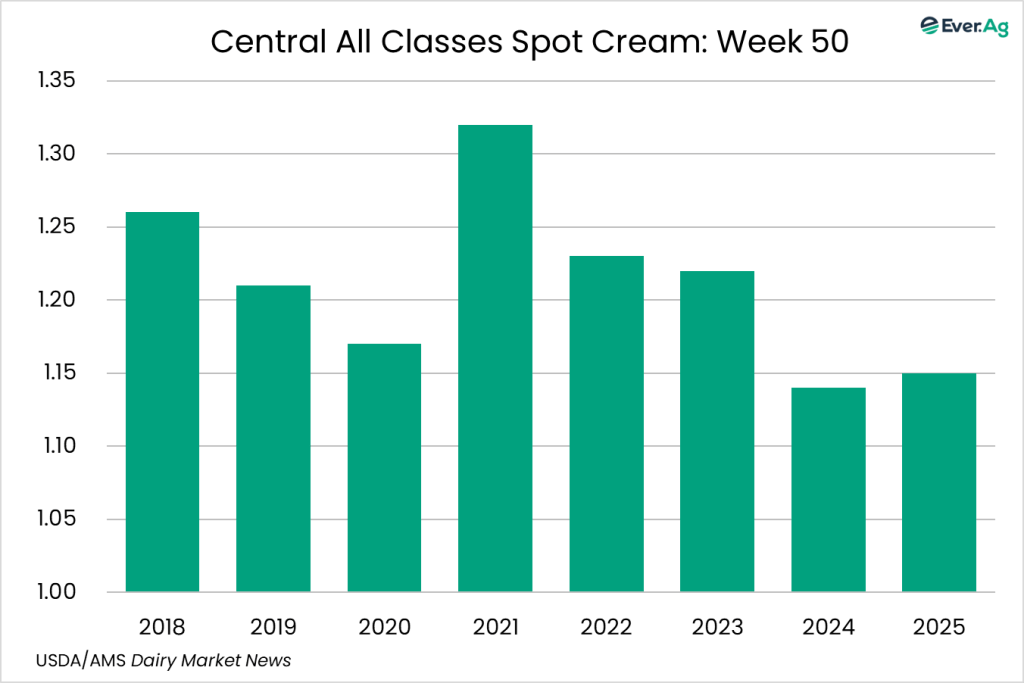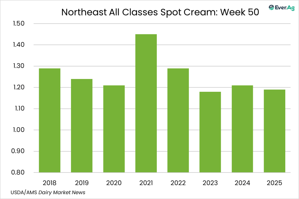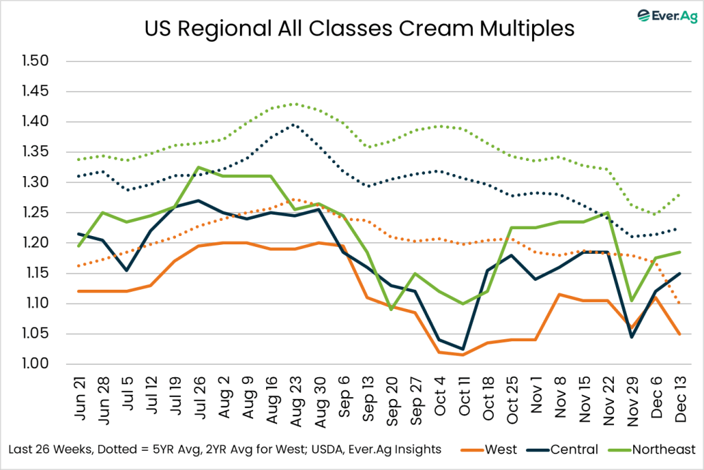 Plenty of cream is available to cover demands. Reported cream multiples are lower for week 50. Condensed skim milk demand and availability is steady.