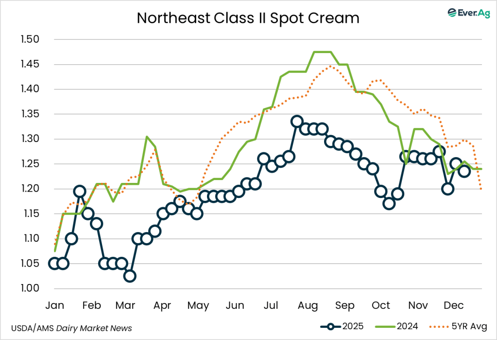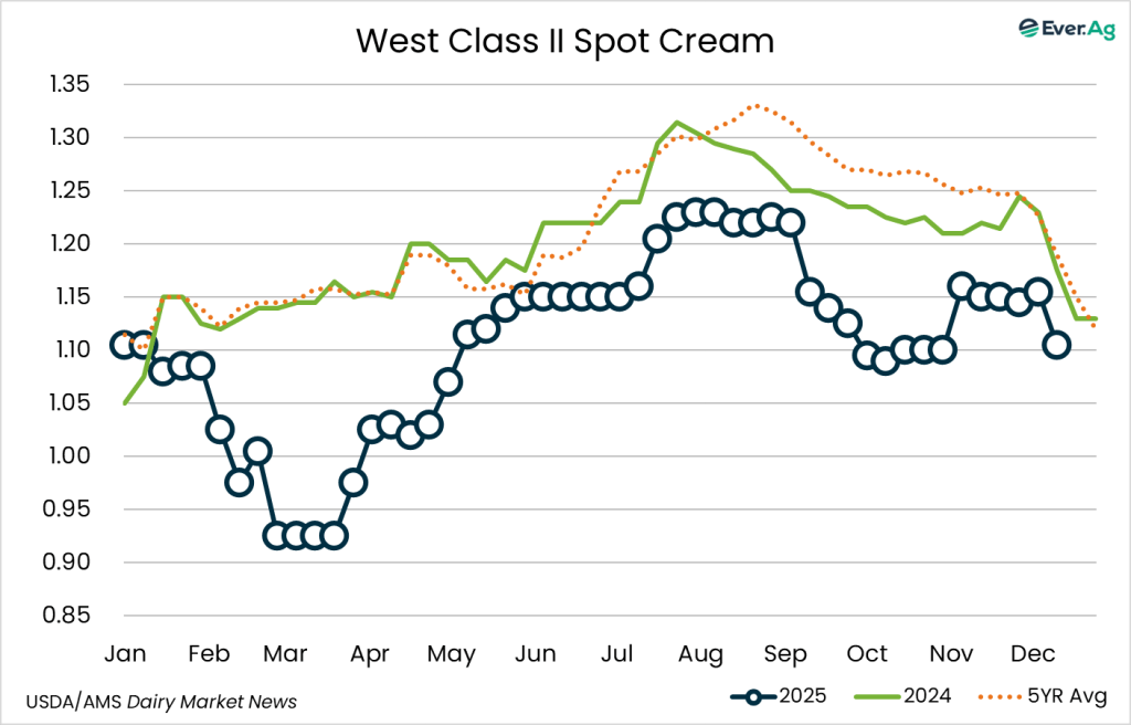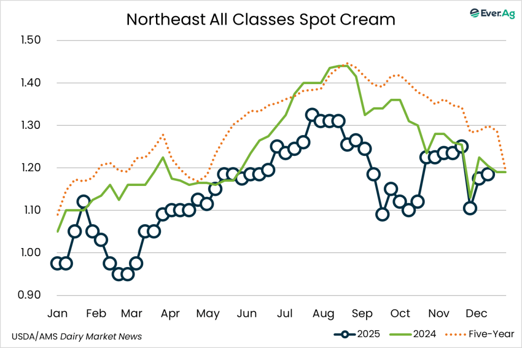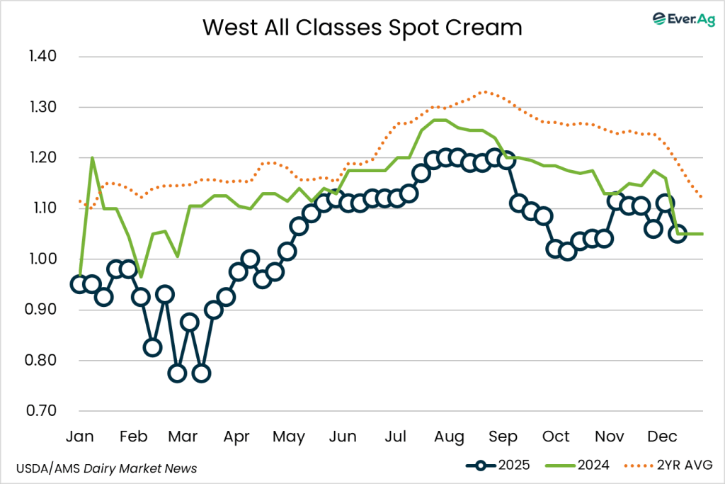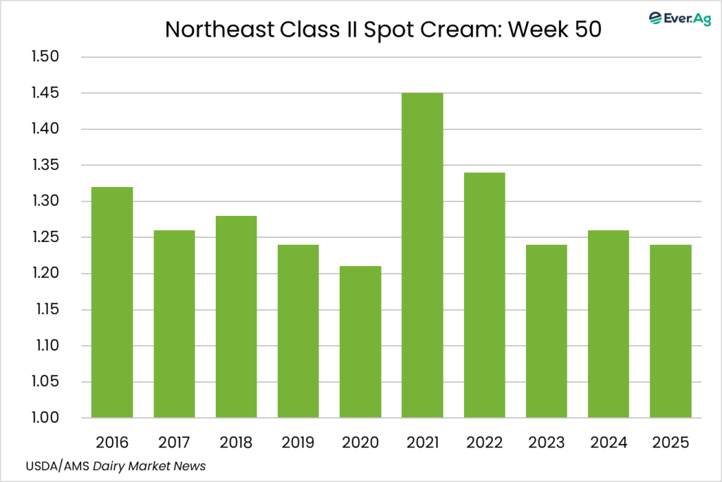 Plenty of cream is available to cover demands. Reported cream multiples are lower for week 50. Condensed skim milk demand and availability is steady.