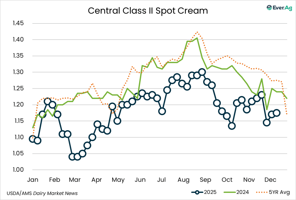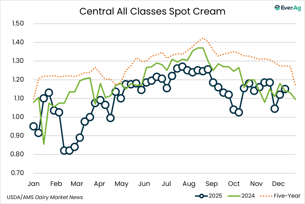 Cream remains available in the Central region, amid strong milk component levels. Contacts say Class I cream demand is steady, but interest from butter makers is light. Butter makers say they are typically using internal volumes to run busy production schedules, rather than turning to the spot market.