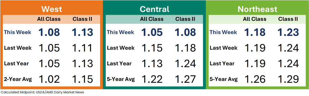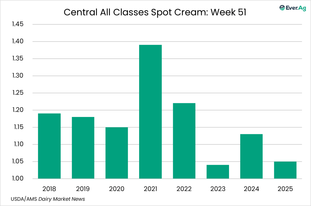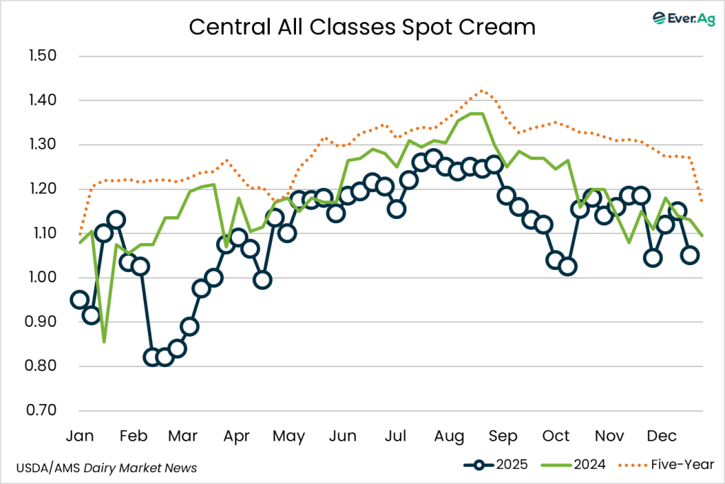 Cream production is strong in the Central region. Cream multiples are lower this week. Scheduled downtime around the upcoming holidays is contributing to lighter demand for cream. Butter makers say they are not purchasing significant volumes of cream currently, as they are primarily using cream internally or selling volumes to prepare for the holidays.