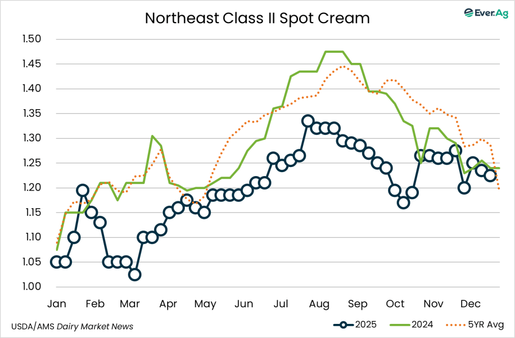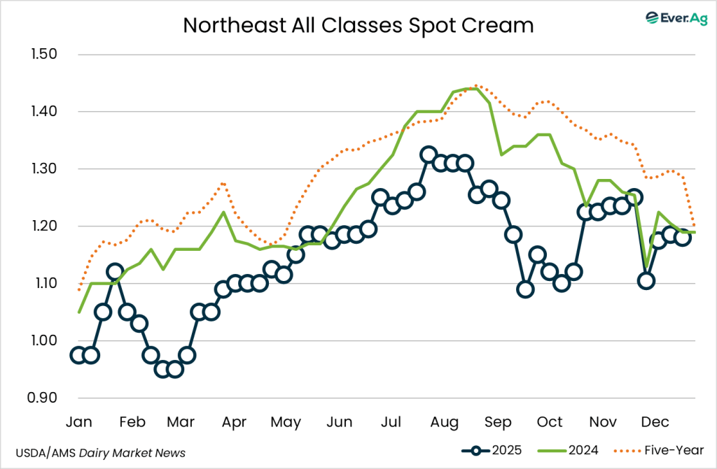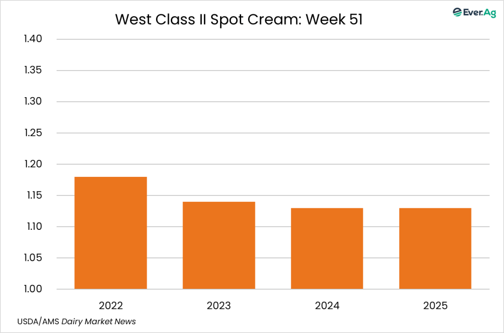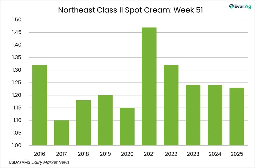 Cream is readily available. Reported cream multiples are higher at the bottom end of both ranges for week 51. Condensed skim milk demand is lighter and loads are available.