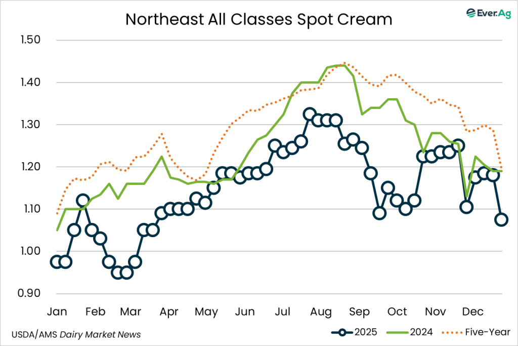 Spot prices of Class III milk range from $9-under to $0.50-over this week. Lower cream multiples were reported this week. Cream production is strong in the region, while demand is lighter due to planned holiday downtime this week and next. Contacts say there is plenty of cream available in the Central region and they anticipate multiples to remain low through the end of the year.
