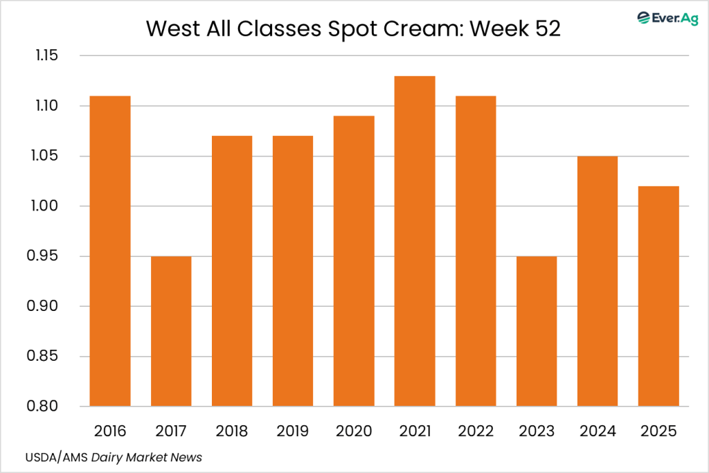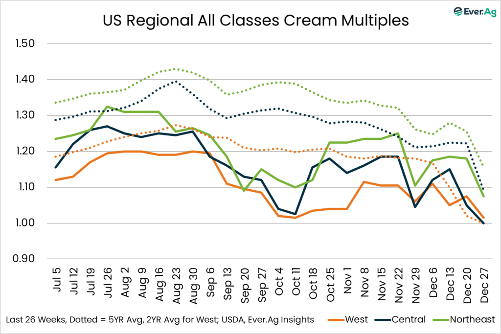Cream volumes are readily available, and multiples are lower this week. Manufacturers requesting contracted condensed skim milk load deliveries are lighter, as expected for the holiday week. Stakeholders report lighter condensed skim milk demand in California, partly attributed to processing facilities permanently closing, but stronger demand outside of California. Condensed skim milk loads are more available this week.