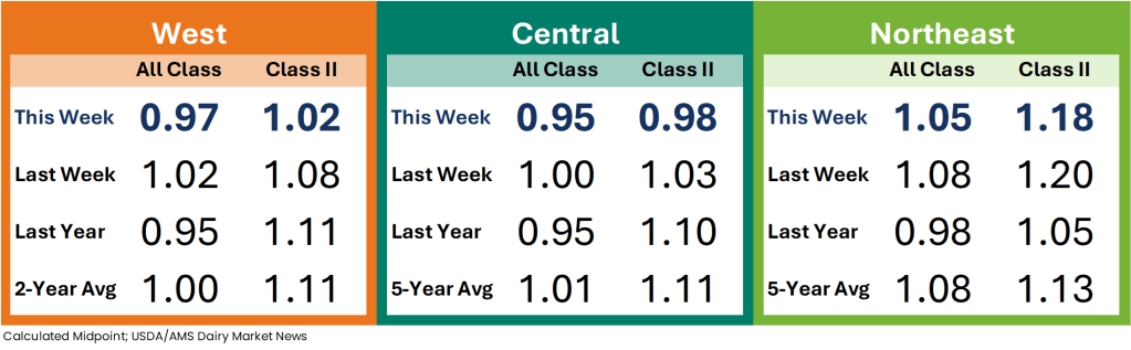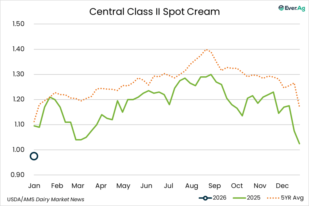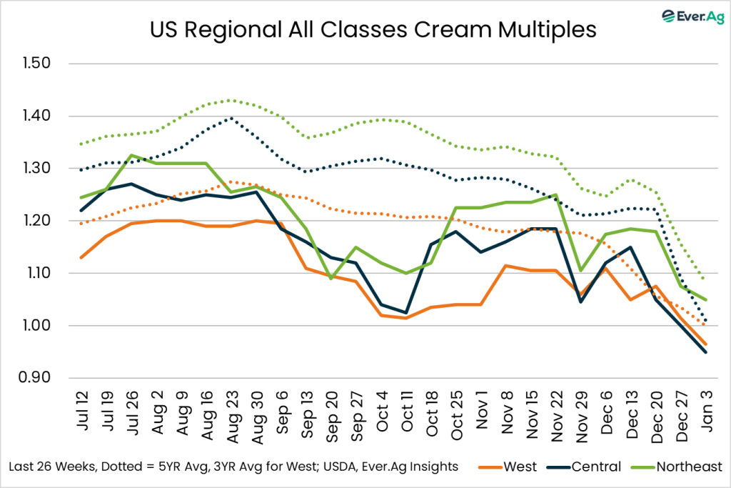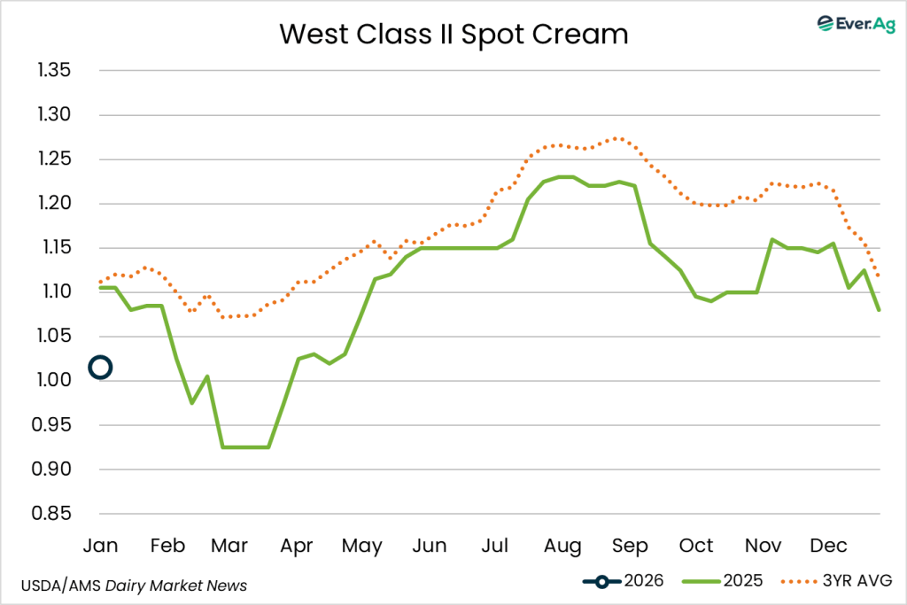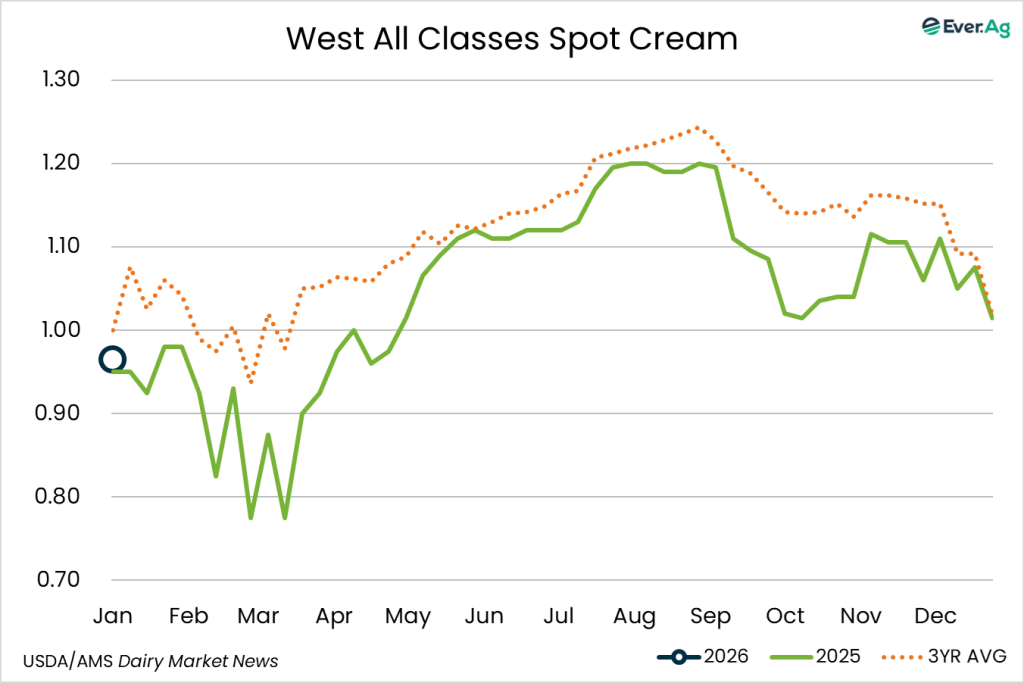 Some butter facilities are operating churns at full capacity to build inventories for 2026. Cream multiples dropped at both ends of the range, with very little spot volume going to Class II or III facilities.