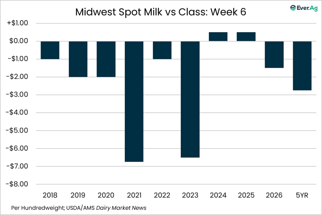 California milk production is trending upward. Handlers indicate January 2026 milk output is up year over year and compared to December. Open processing time in the Central Valley is hard to come by. Some plant managers note it is challenging to manage milk volumes more than a few weeks ahead of time. Spot loads are available. Stakeholders indicate calf ranches are receiving some milk loads. Arizona and New Mexico handlers convey farm level milk output is steady. New Mexico processors indicate road closures, unplanned downtime, and distressed milk volumes have decreased. Milk production in the Pacific Northwest is steady. Some manufacturers are securing additional loads of milk for their production facilities. Milk production in the mountain states of Idaho, Utah, and Colorado varies from steady to stronger. Although some spot milk loads are available, manufacturers indicate milk volumes are decently balanced with production capacities. Class I and II demands are steady, while Class III and IV demands vary from steady to stronger throughout the region.