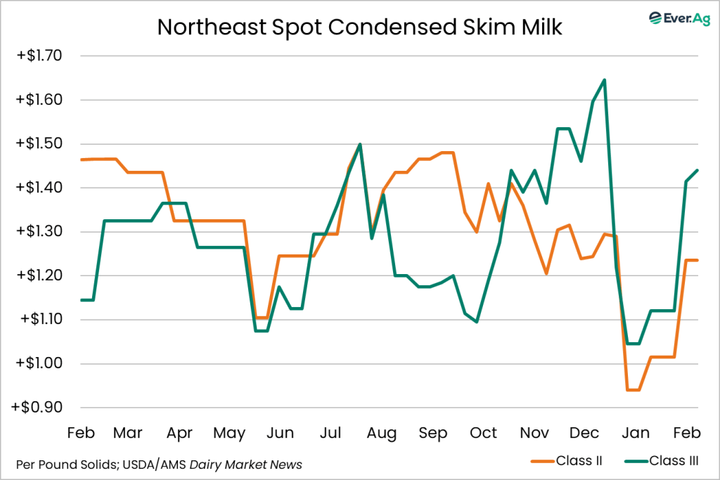 Milk production is stable this week, with the latest USDA Milk Production Report indicating continued growth in the Eastern Region. New York remains the primary driver of the increase, reflecting both increased herd size and improved per-cow productivity. Herd growth appears aligned with the need to expand dairy manufacturing capacity within the state, and pulls from New York remain steady as raw milk continues moving into ultra-filtered milk production. No weather impacts on milk deliveries were reported. Class II demand is reported as normal ahead of the seasonal draw on cream expected to begin near May. Fluid demand for Class III is adequate to keep facilities operating full schedules to meet steady bulk business and strong retail interest. Contacts report condensed skim demand is unseasonably elevated, with some contacts suggesting needs for later in the year are being pulled forward. While Class II utilization is described as normal, Class III utilization is unexpectedly higher.