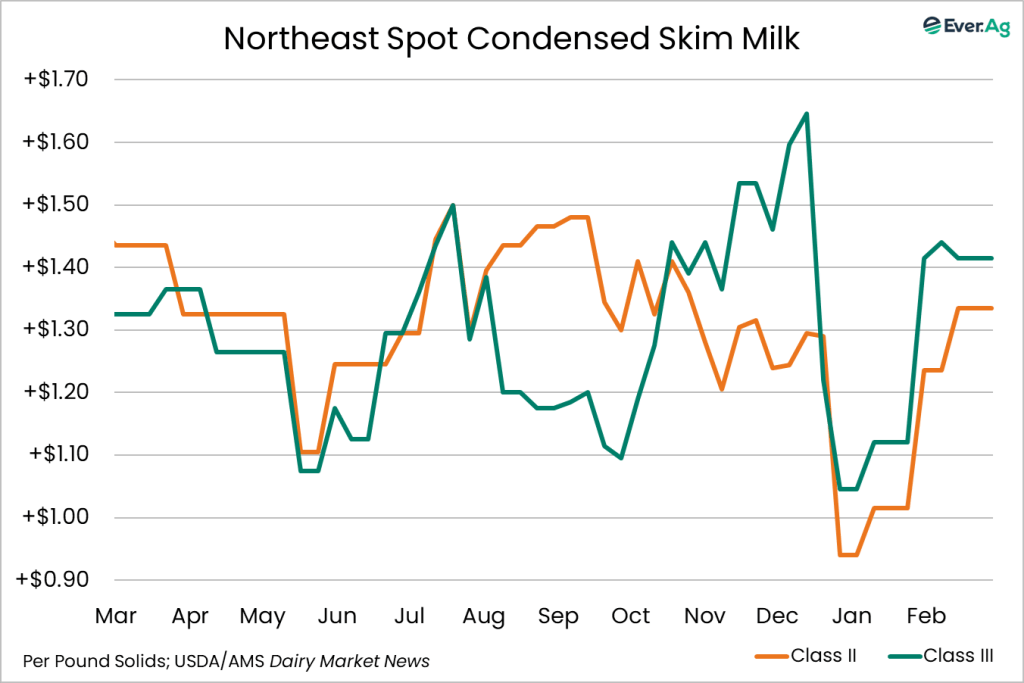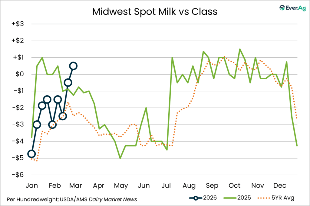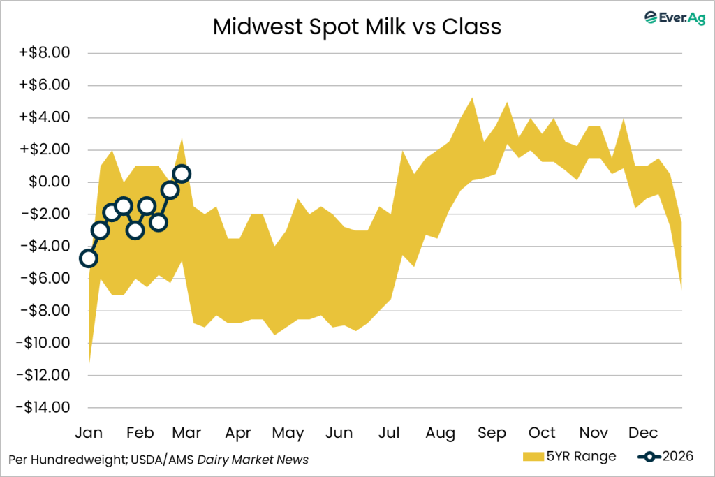 Milk production is seasonally strong across the East region. The National Agricultural Statistics Service (NASS) recently published January milk production results and the East region saw a 1.2% milk volume increase in January 2026 compared to January 2025. Georgia experienced the largest volume increase while Pennsylvania was the only state that experienced a decline in production. Class I production is strong, and bottlers are looking to secure spot loads of milk, specifically in the Southeast. Class II production is on the rise, and many facilities are securing spot loads of cream. Ice cream production is seasonally increasing and accounting for a large portion of the increased demand. Class III production is steady. Retail and food service demand is balanced and accounting for most of the production in the region, while domestic bulk sales are slower than anticipated. Class IV demand is strong. Milk demand is strong and inventories are tight, encouraging manufacturers to keep dryers running.