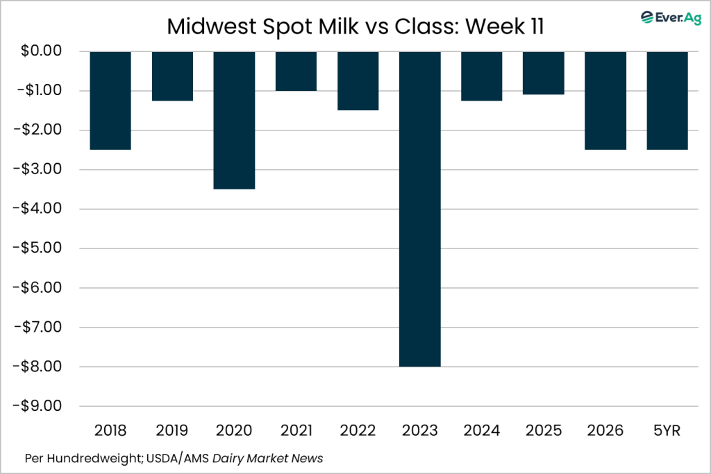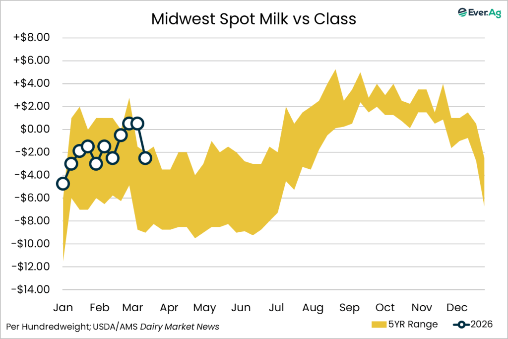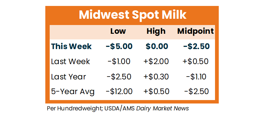 Contacts in the Central region say milk output continues to increase, and production is up from this time last year. Warmer weather is prevalent throughout the region this week, though forecasts show lows dropping to the single digits in the upper Midwest in the next week. Demand for Class I is unchanged, while Class II and IV demand is strengthening. Class III spot milk prices range from $5-under to flat, down from last week. Contacts say demand for Class III milk is unchanged, but cheesemakers with downtime are offering additional spot volumes of milk this week. Some cheesemakers say they are unable to take on additional volumes of milk, as they are already running full schedules with volumes they have internally. Milk component levels are down slightly from last month, but stakeholders say increased milk output is keeping cream production strong.