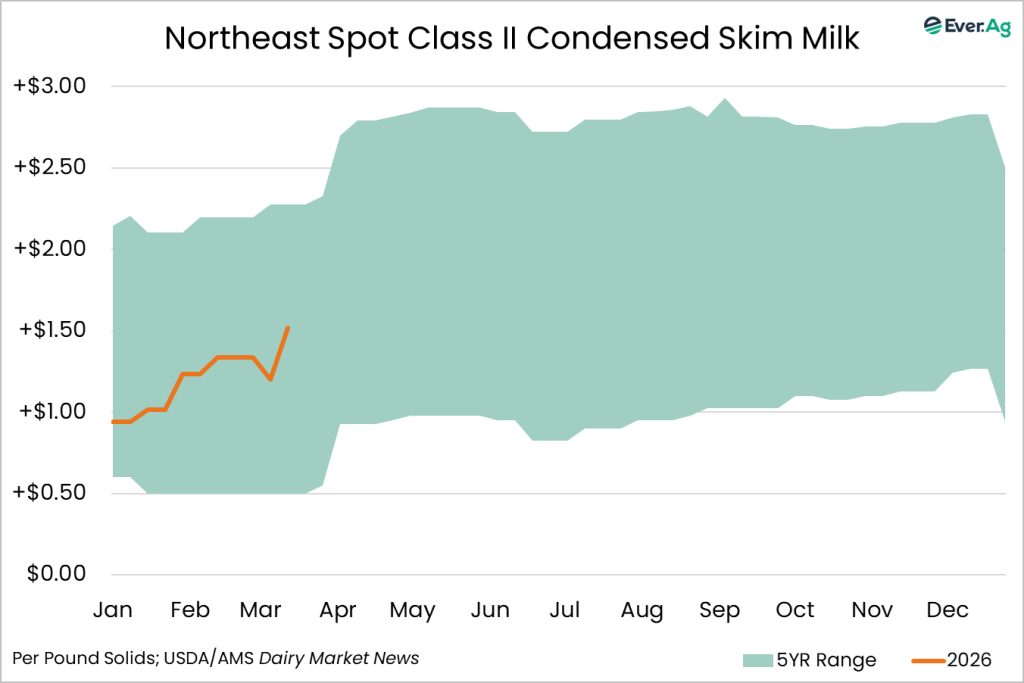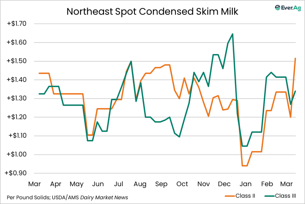 Milk volumes in the East region remain seasonally strong. Mild temperatures are contributing to increased cow comfort. Contacts mention milk components are lower than previous months but strong compared to previous years. Class I demand is steady. Bottlers anticipate a temporary drop in demand as educational institutions are in their spring breaks. Class II demand is strong. Increased ice cream production and the upcoming spring holidays are contributing to higher demand for spot volumes of cream. Class III production is steady in the Northeast. Cheese makers are utilizing contracted volumes of milk to meet demand. Class IV demand is strong. Butter and milk powder prices are on the rise and manufacturers are operating churns and dryers seven days a week to meet demand.