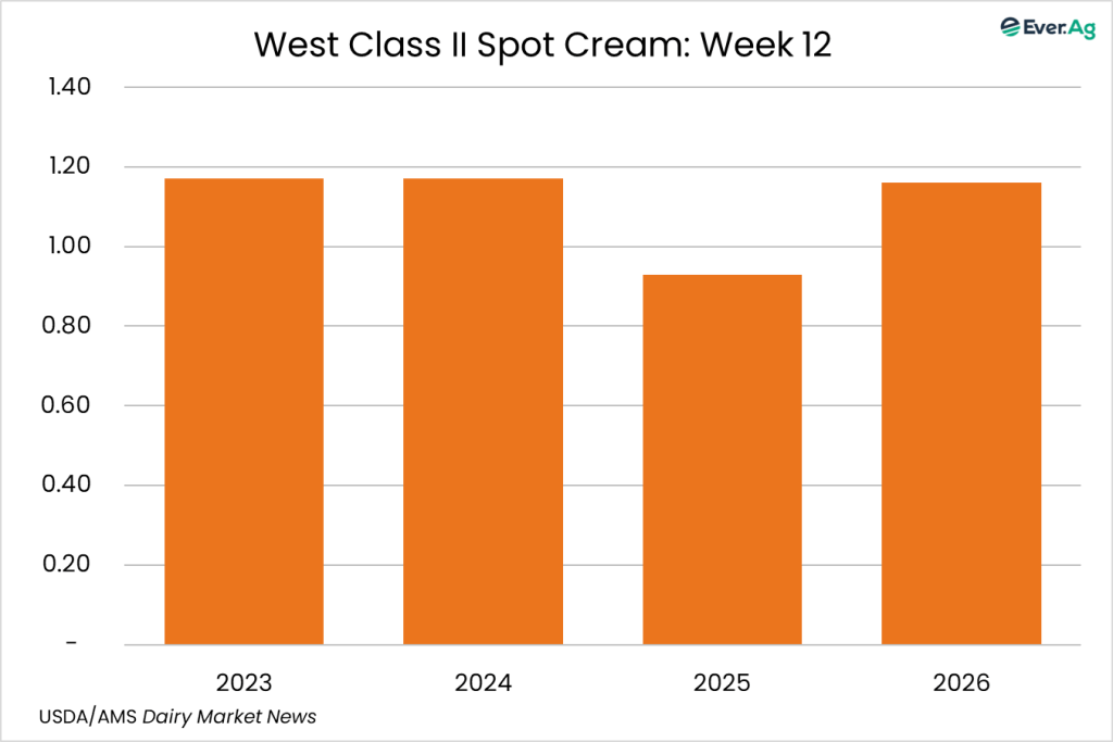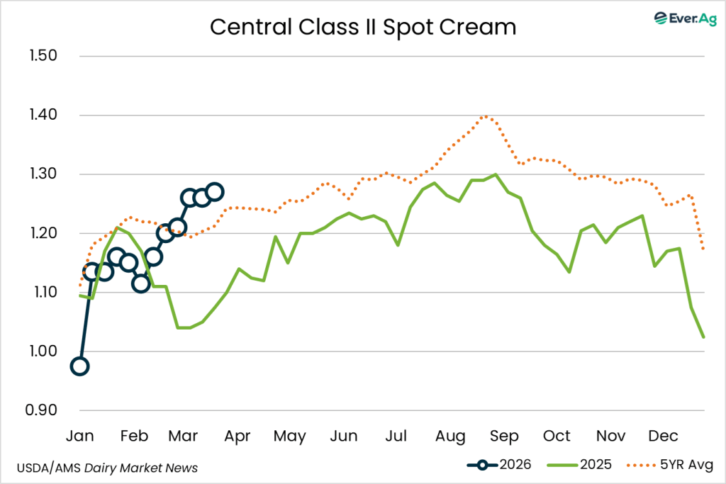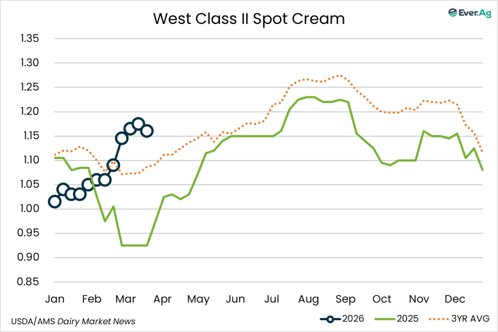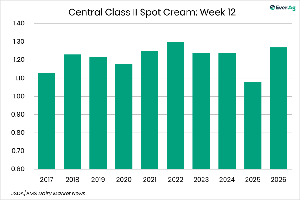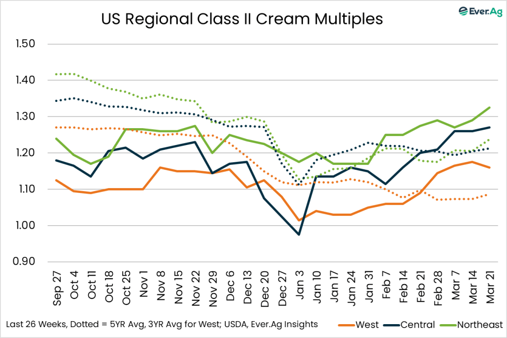 Cream production is strong in the region, as milk components remain up from last year. Class II cream processors continue to pull in large volumes of cream. Spot sales of cream to butter makers are limited as some processors continue to use volumes from within their network to keep churns active.