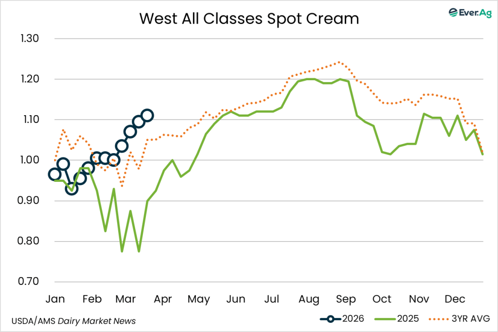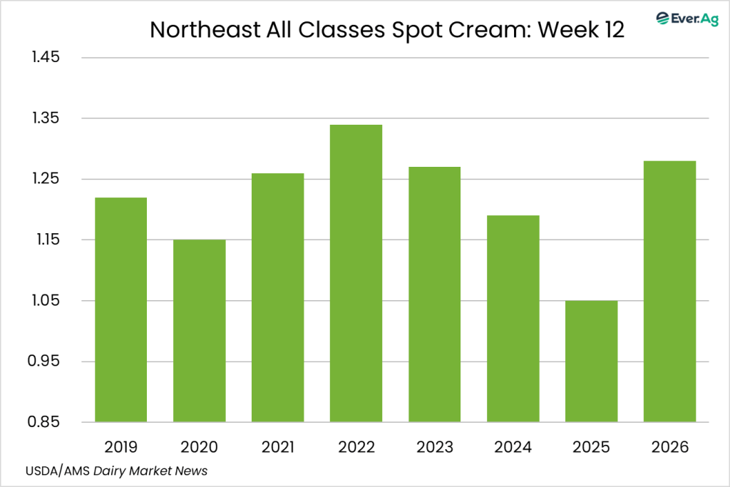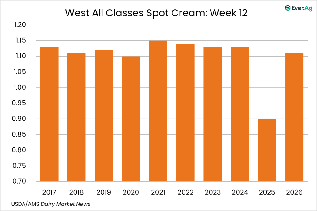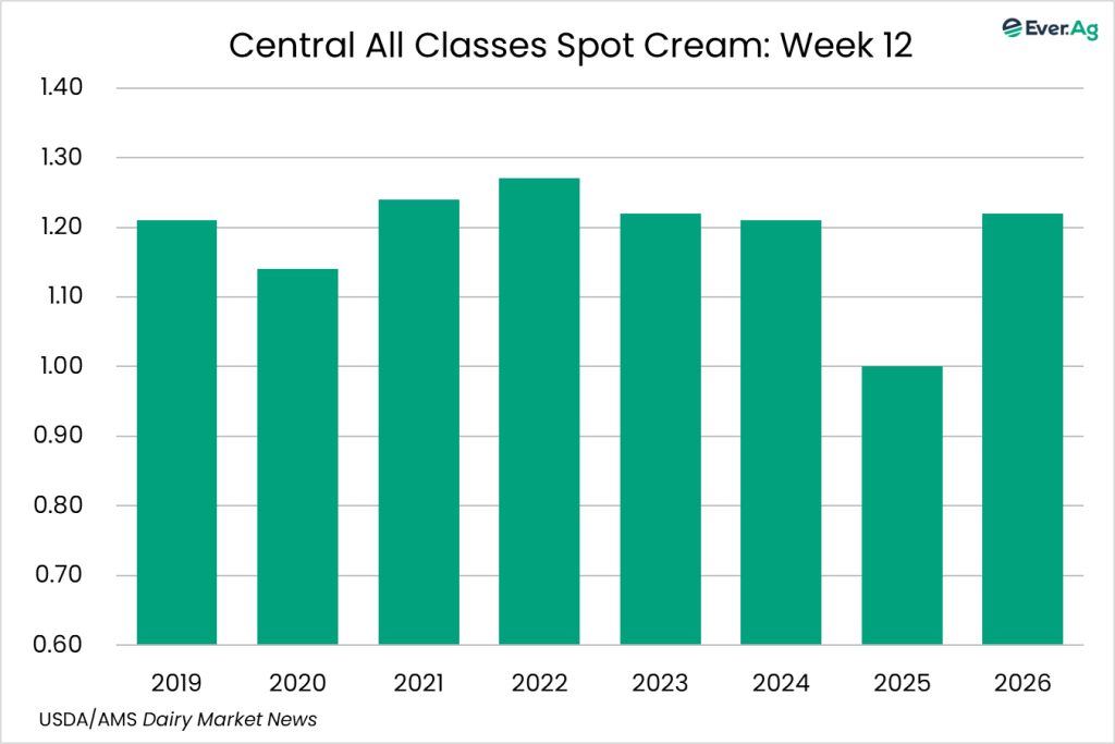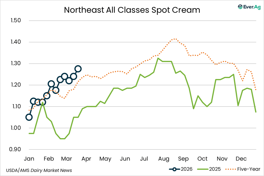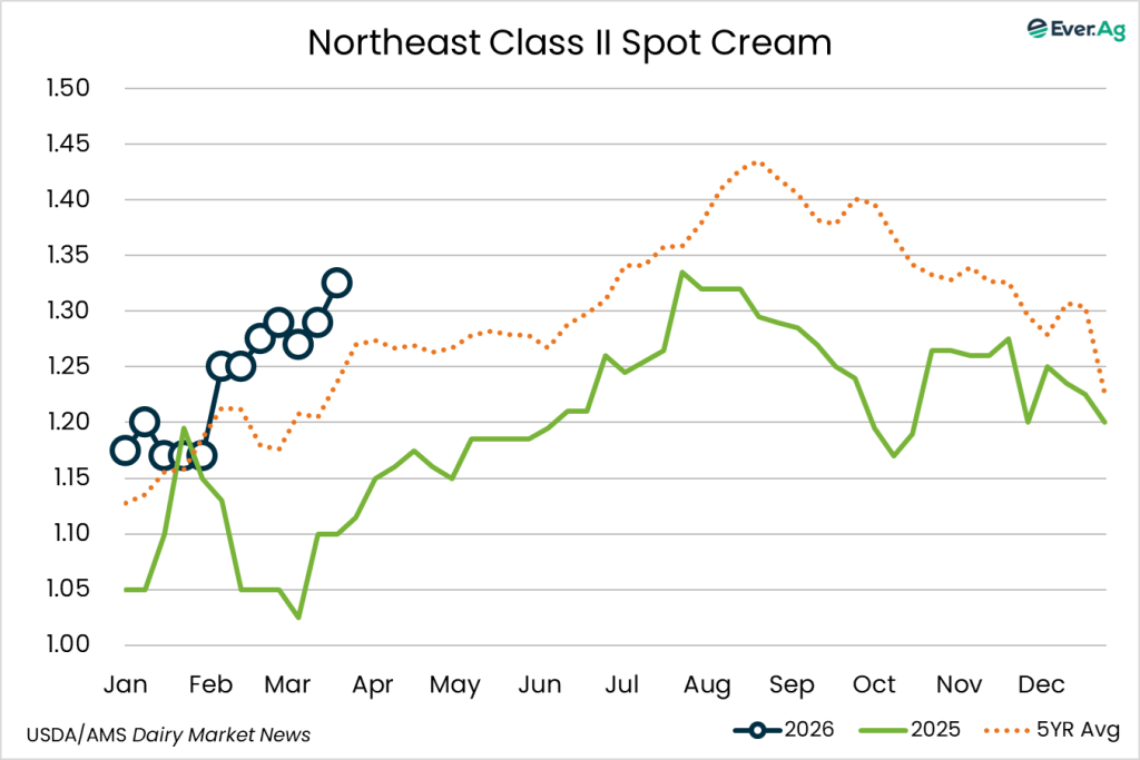 Cream production is strong in the region, as milk components remain up from last year. Class II cream processors continue to pull in large volumes of cream. Spot sales of cream to butter makers are limited as some processors continue to use volumes from within their network to keep churns active.