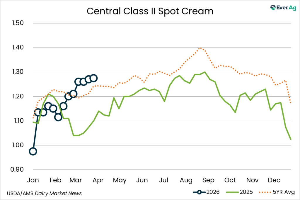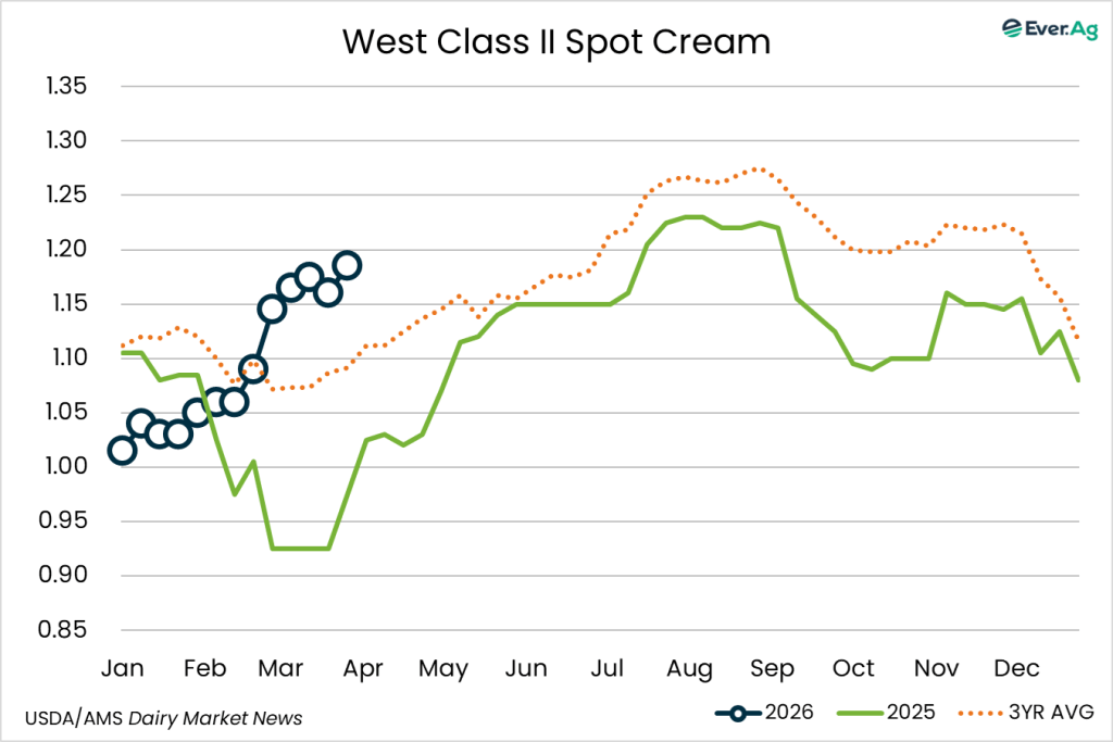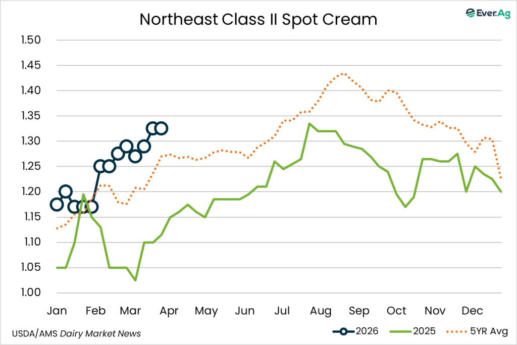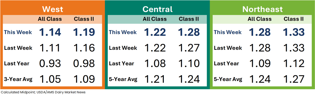 Milk components remain up from this time last year and cream production is strong. Inventories are somewhat tight, due to strong Class II demand. Churns are active in the region, but butter makers say they are buying few spot loads of cream as they are primarily using volumes from within their network.