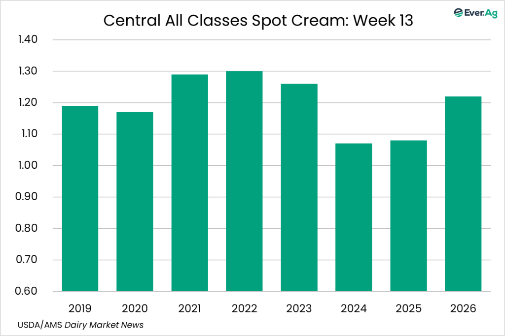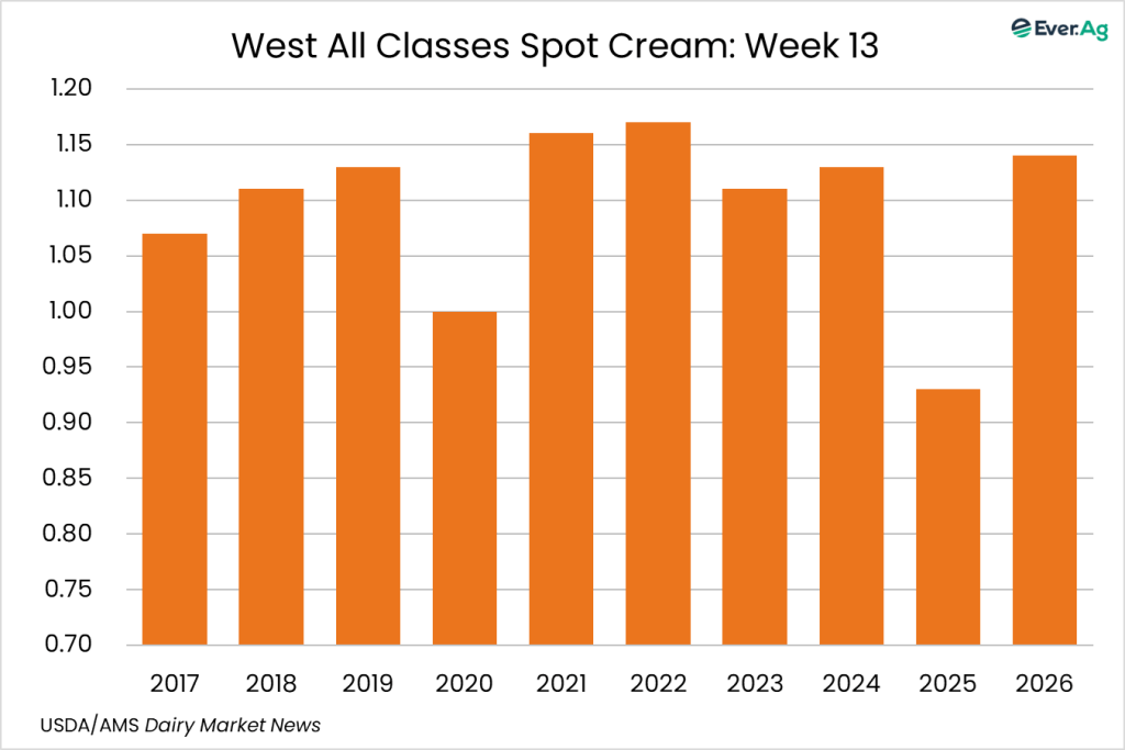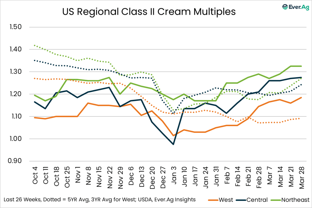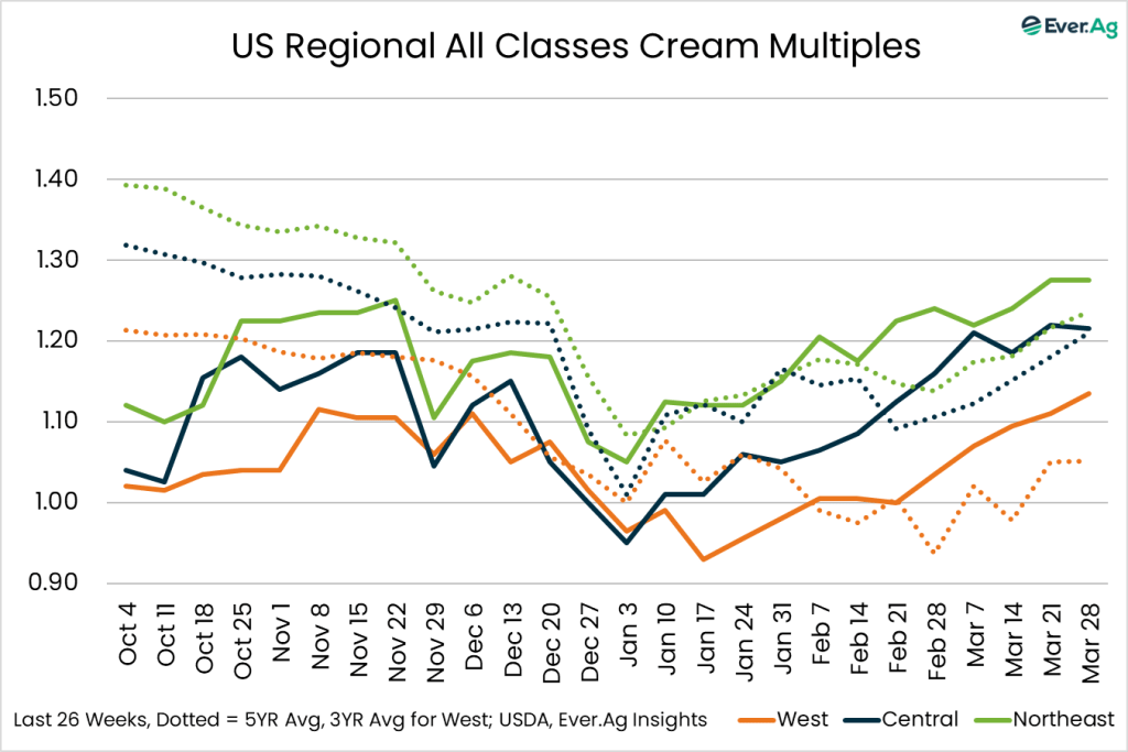 Cream multiples increased at the bottom of both ranges. Cream availability is slightly tighter. Cream demand is somewhat stronger, but some buyers are passing up loads due to freight costs.