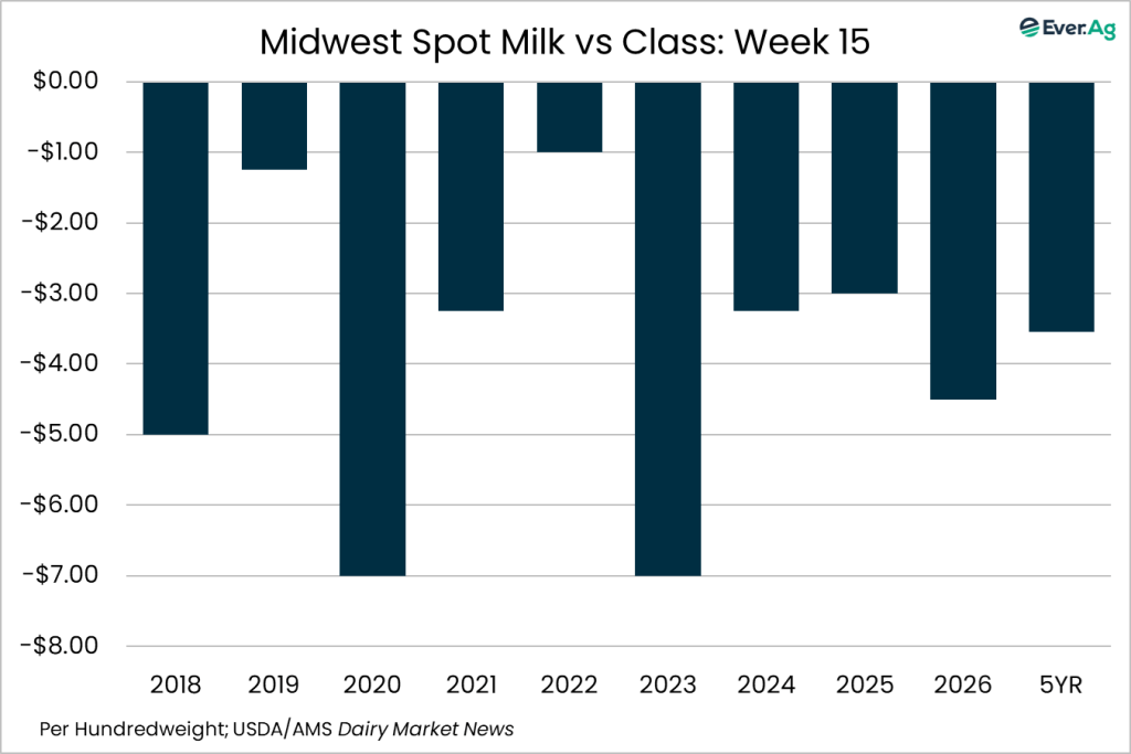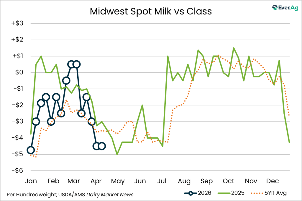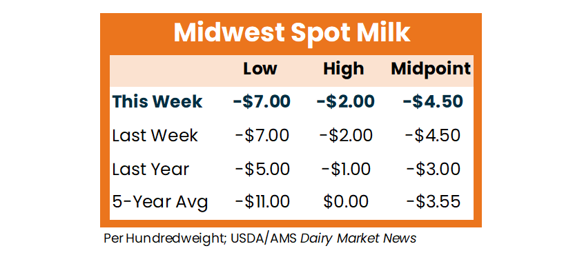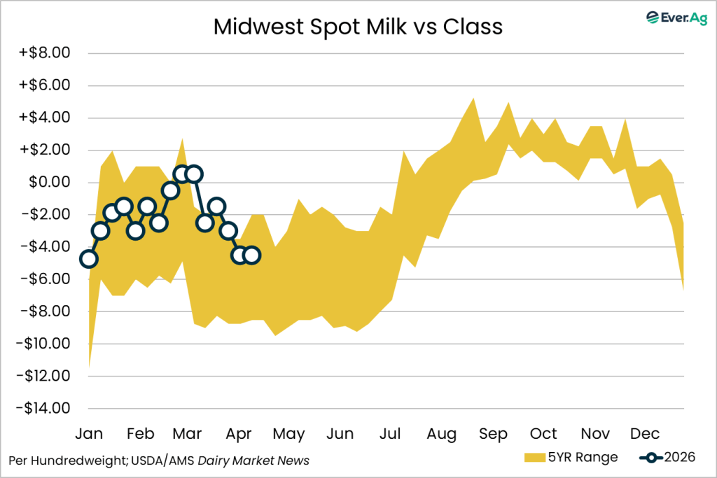 California milk production is steady. Handlers report March 2026 milk production is up slightly from the prior month. Year over year milk production for March 2026 is up also. Processors are busily working through milk volumes. Central Valley manufacturers report milk volumes are more manageable and production is running well. Arizona farm level milk output is steady. Some manufacturers are bringing in spot milk to fill open processing capacity and run busier production schedules. Handlers in New Mexico report peak spring milk production is at hand. Pacific Northwest milk production varies from steady to stronger. Some manufacturers are bringing spot milk loads into their production facilities from sellers inside and outside of the Pacific Northwest. Farm level milk output in the Mountain States of Idaho, Utah, and Colorado is steady. Spot milk loads are readily available with some manufacturer downtime in the Mountain States. Stakeholders report that peak spring milk output volumes are good. Class I demand is stronger with many educational institution’s spring breaks completed. Class II demand varies from lighter to steady. Class III and IV demands are steady.