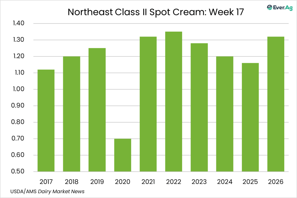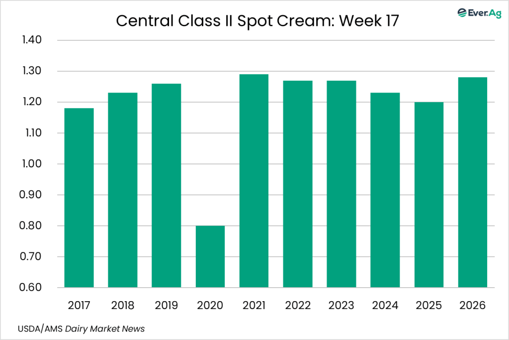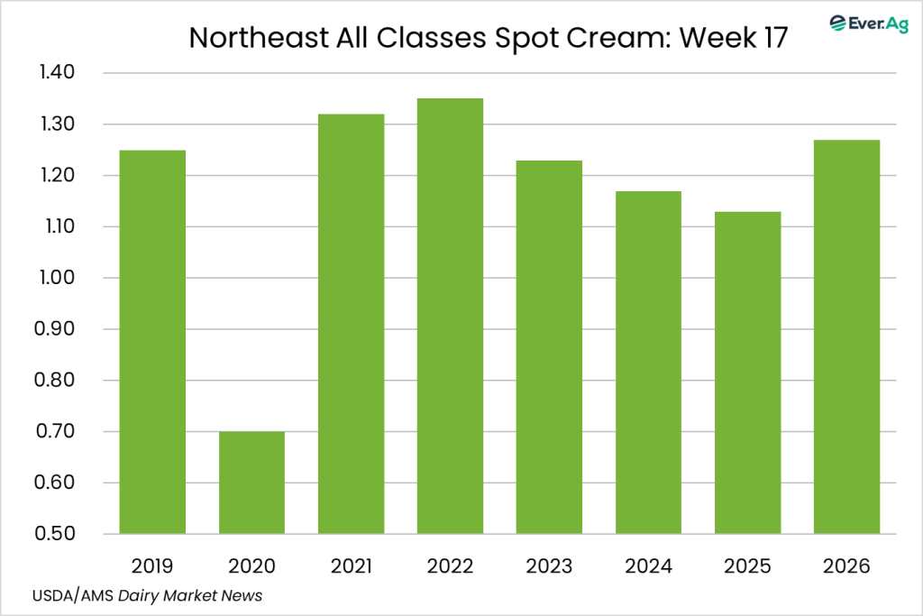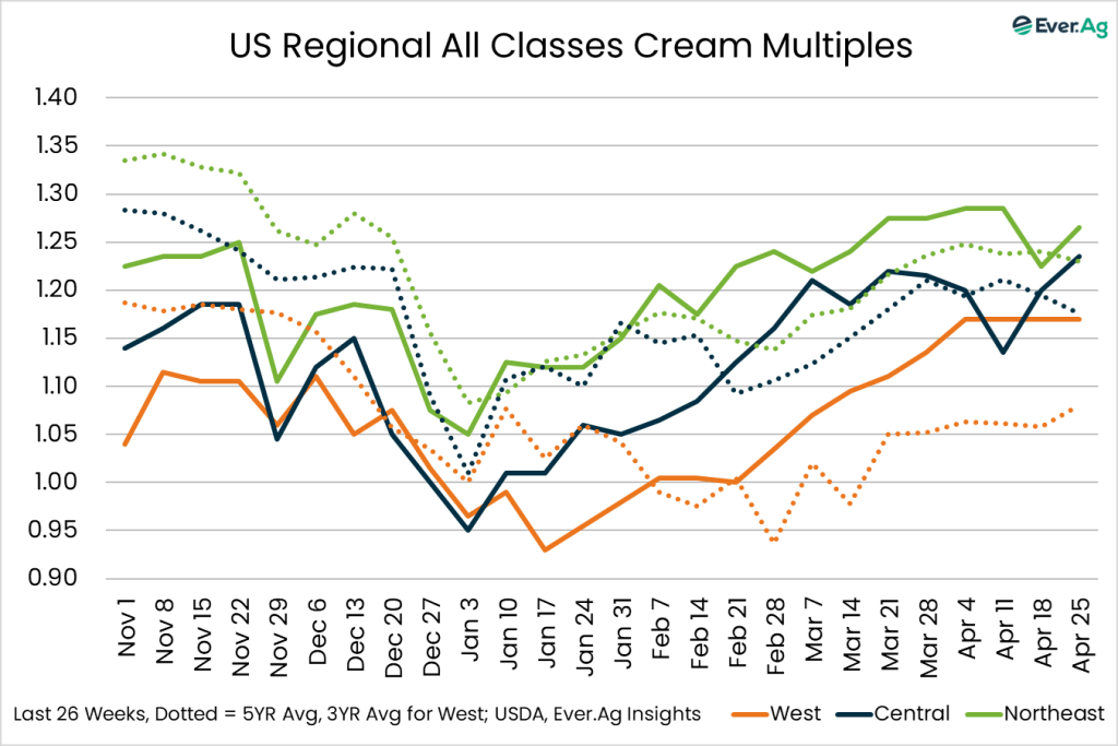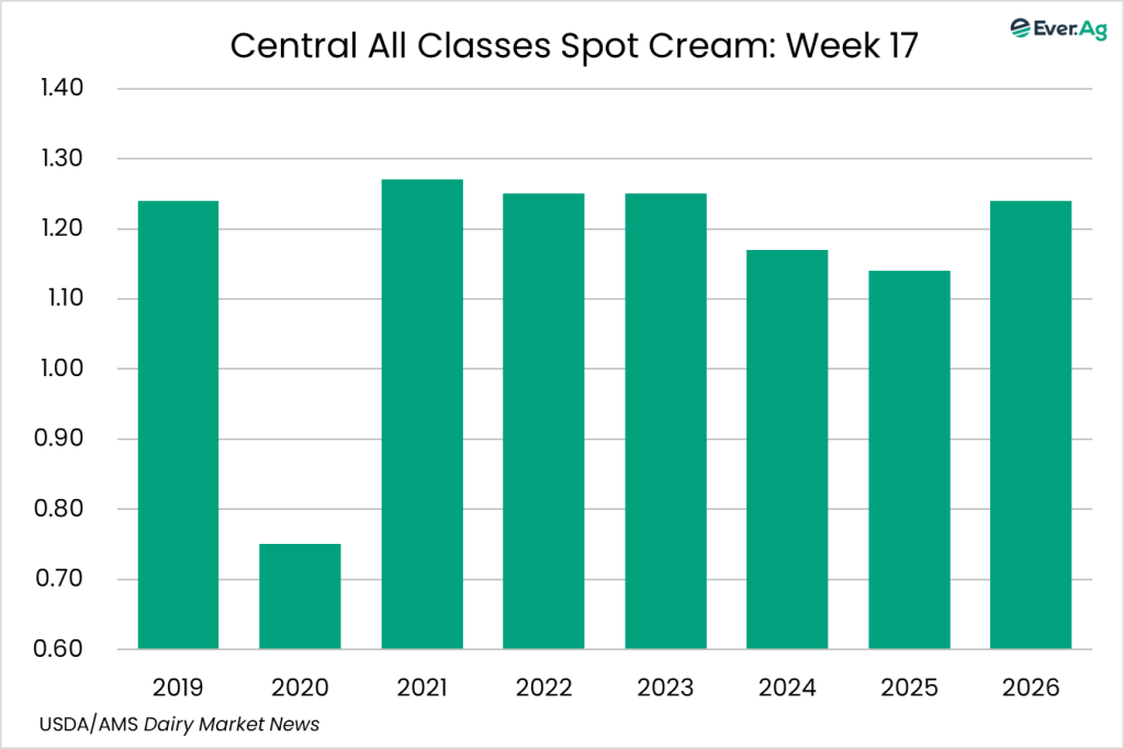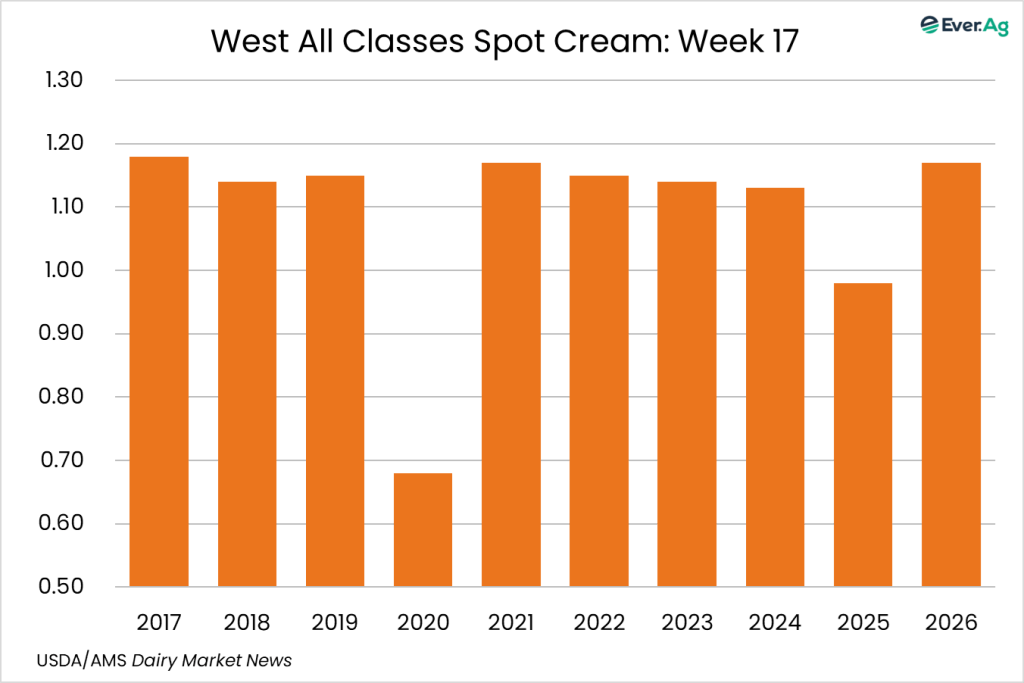 Spot cream loads are available. Demand is stronger, but sellers don’t always receive interest at a price point for making a transaction. Cream multiples are unchanged for week 17.