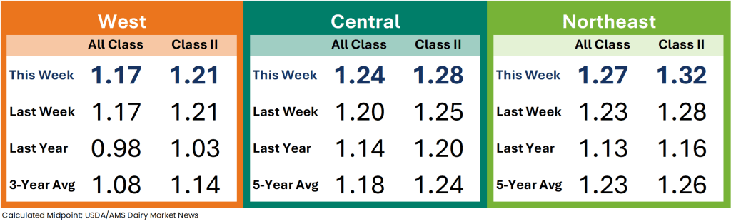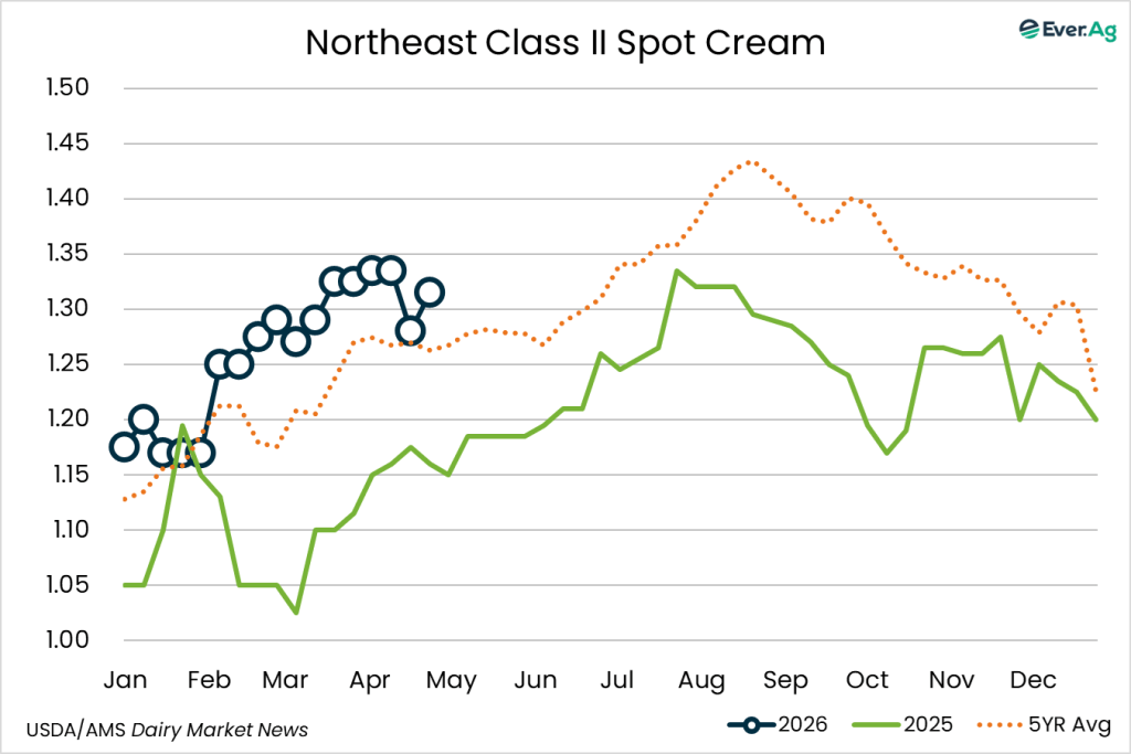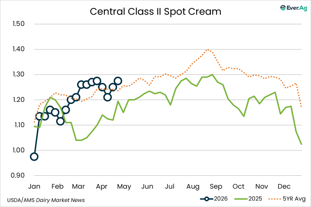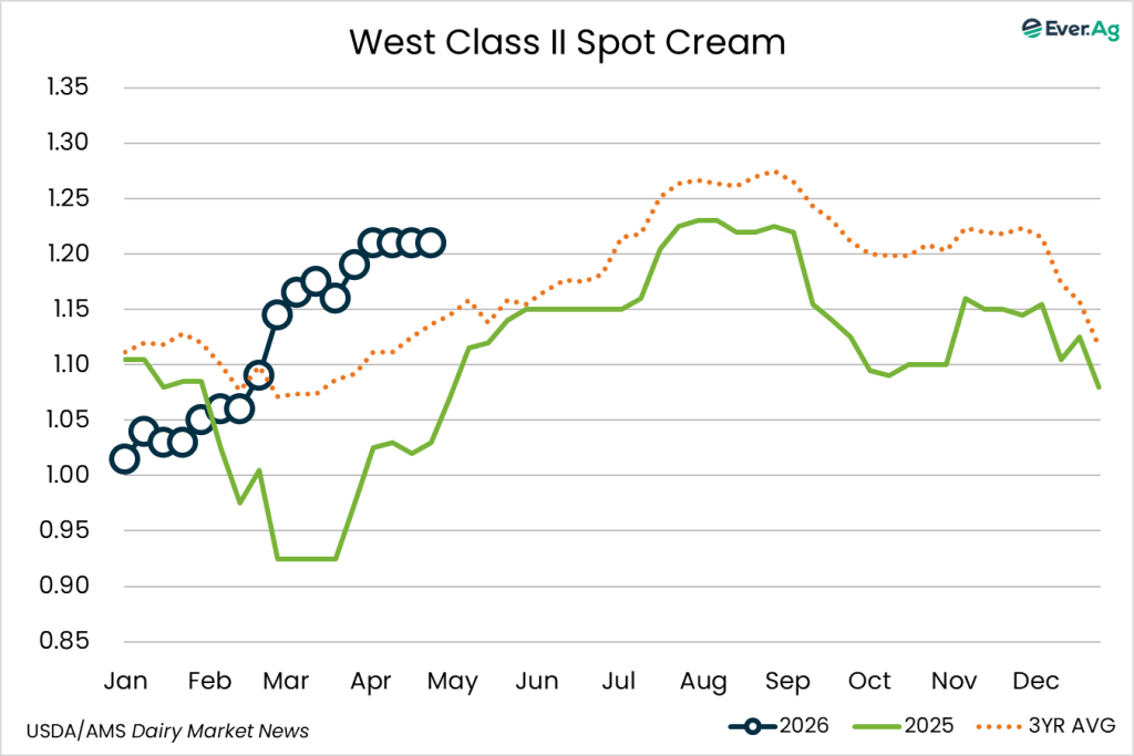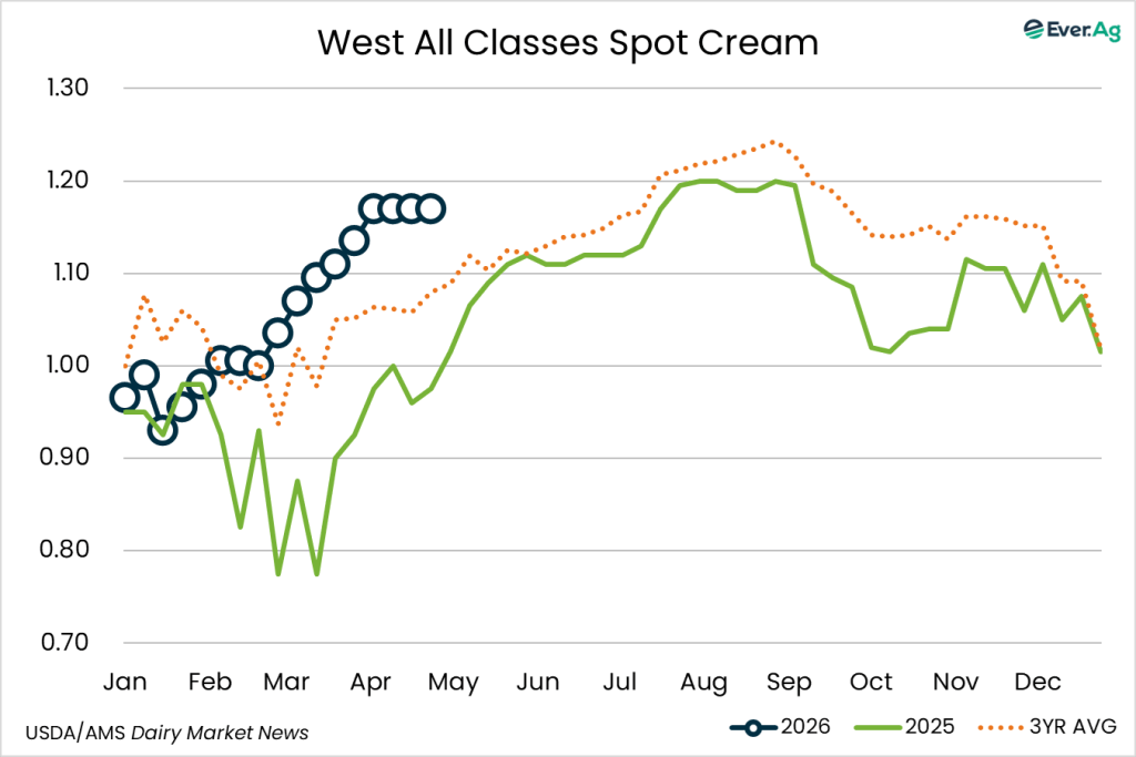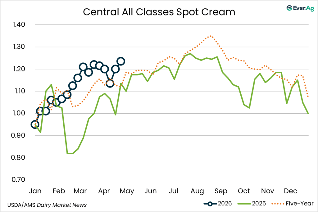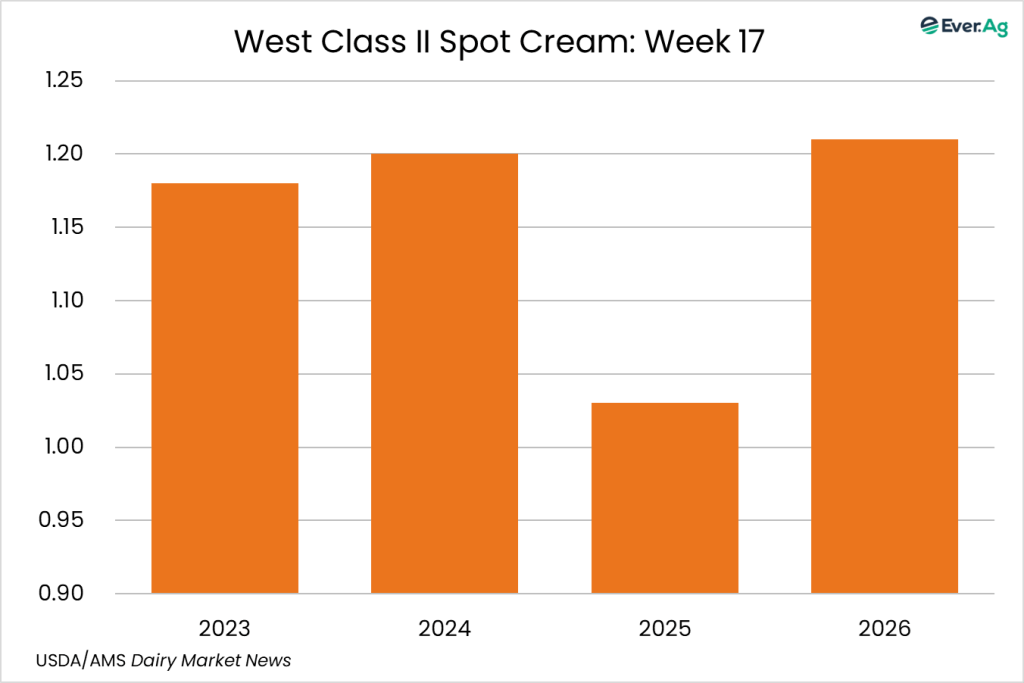 Spot cream loads are available. Demand is stronger, but sellers don’t always receive interest at a price point for making a transaction. Cream multiples are unchanged for week 17.