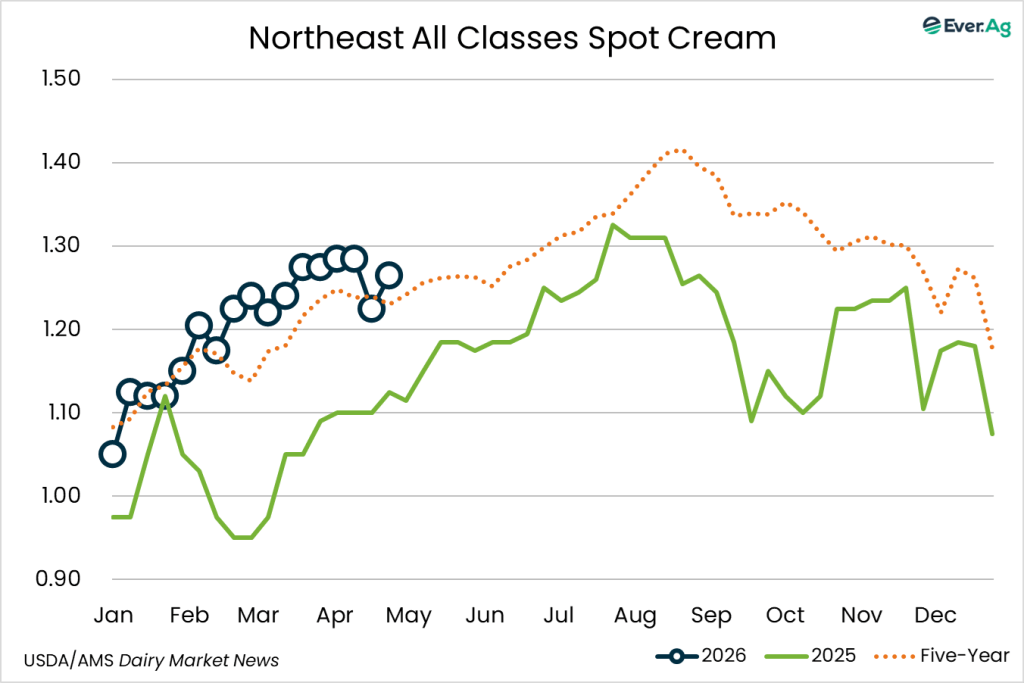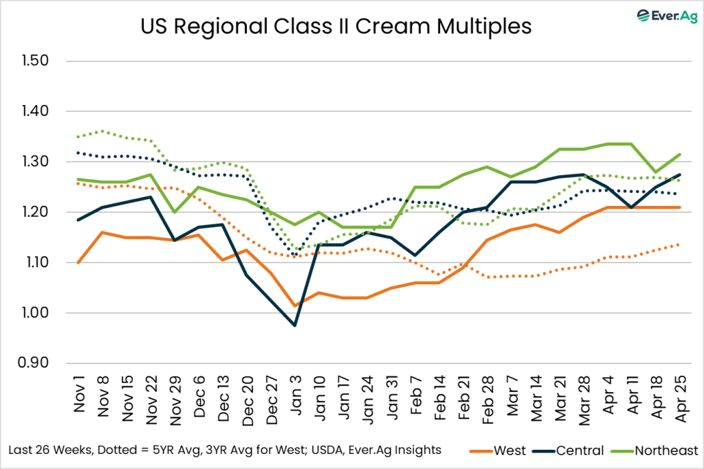 Cream multiples increased at both ends of the range this week. Ice cream manufacturers are purchasing spot volumes of cream to keep production schedules busy.